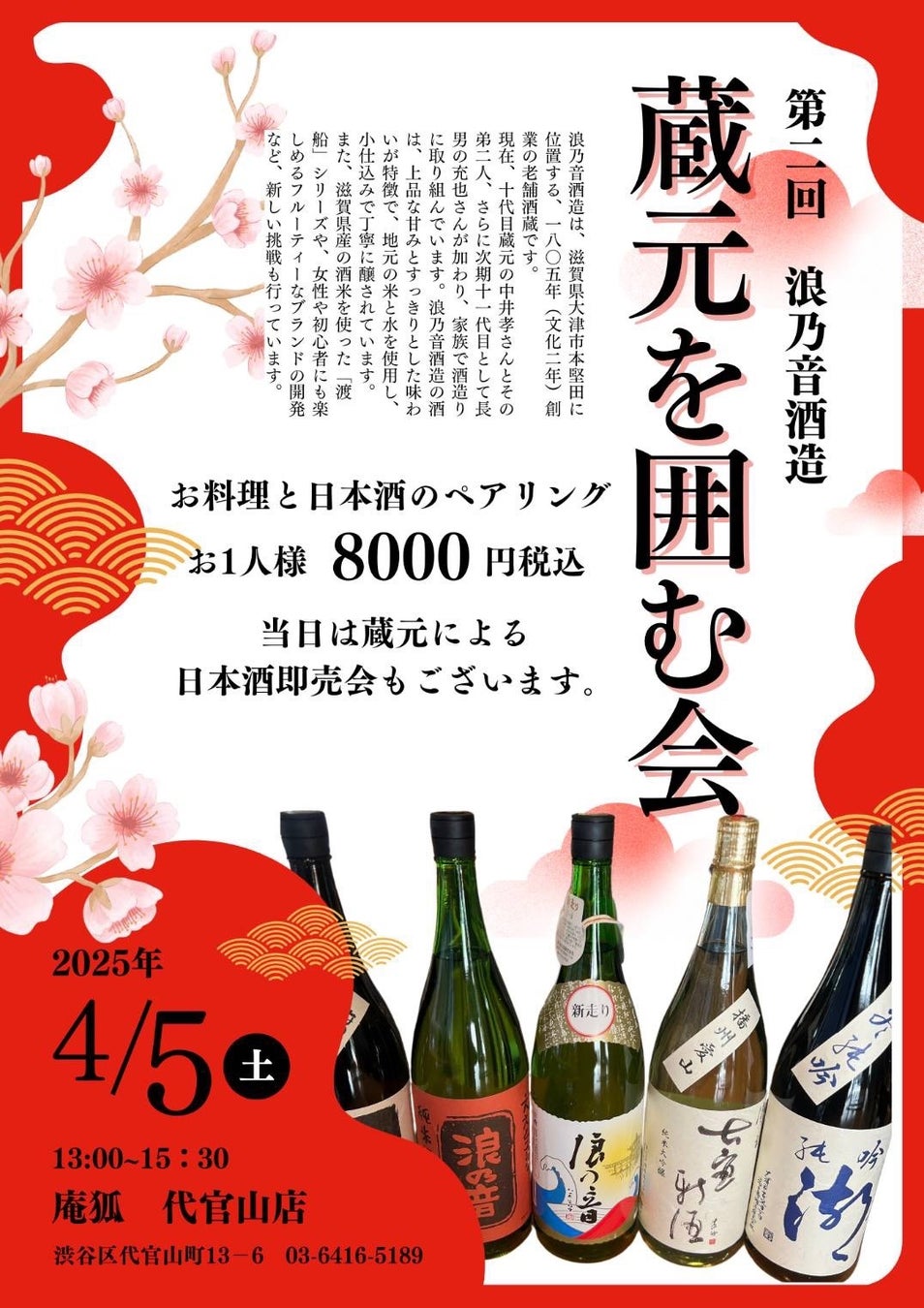 また、蔵元の方が来場し、日本酒の説明や蔵元ならではの話を聞くことができる貴重な機会です。イベント参加費は8,000円(税込)で、非常にお得な内容となっています。さらに、当日は日本酒の購入も可能です。美味しい料理と日本酒のマリアージュを楽しみながら、特別なひとときを過ごしてみませんか?