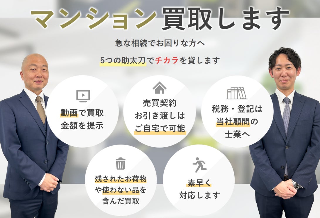 「助太刀買取マンション」は、急な相続でお困りのマンションについて売却のサポートをするサービスです。物件内に残されたお荷物や使わない品が残された状態でも、それを含めて買取します。売買時の仲介手数料もかかりません。