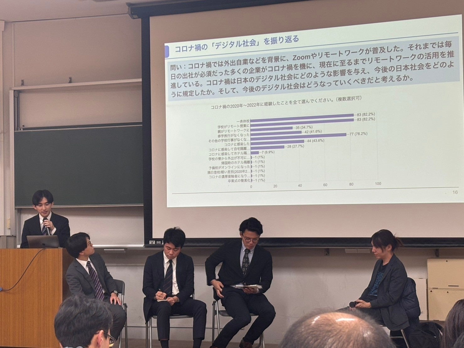 「コロナ禍のデジタル社会」パートでは、東大生側から独自調査で「学校がリモート授業になった」と答えた若者の割合が8割以上にのぼったことを指摘。