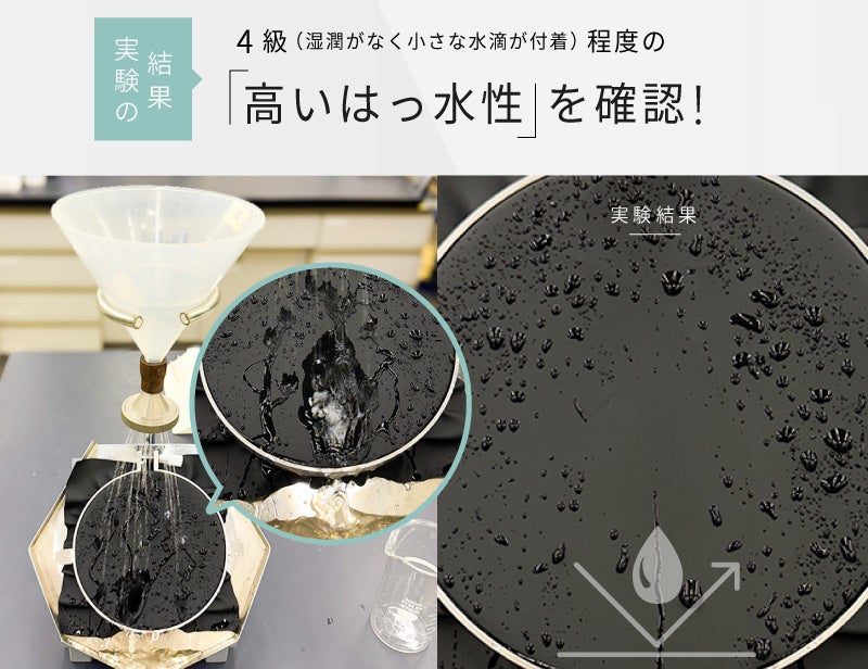 Eimlessのスマホポーチは専門の研究機関で耐水試験を実施済みPUレザーを採用しています。実験の結果、4級(湿潤がなく、小さな水滴が付着)程度の高いはっ水性を確認しています。