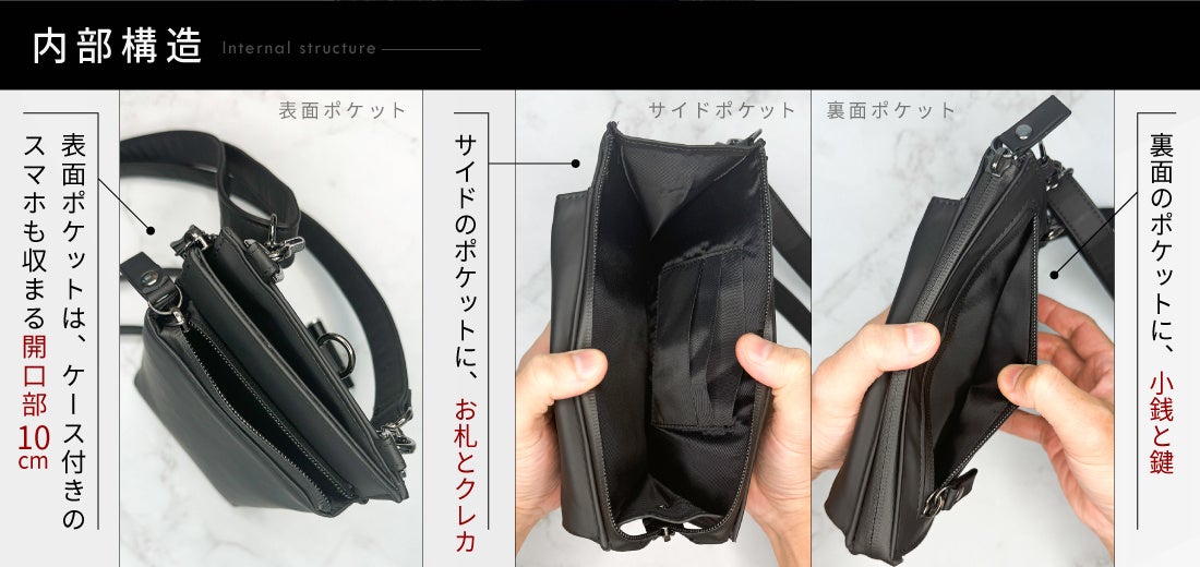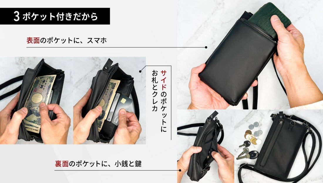 1.必要最低限の荷物の持ち運びにピッタリな小型&3ポケット付きスマホポーチ