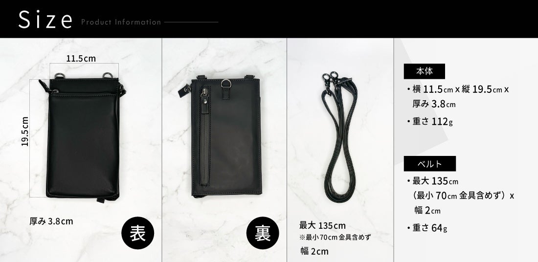 薄型&横11.5cmx19.5cmの小型サイズなので、いつでも携帯しておきたいスマホやクレカ、現金、チケット、パスポートは首から下げて携帯可能。 -