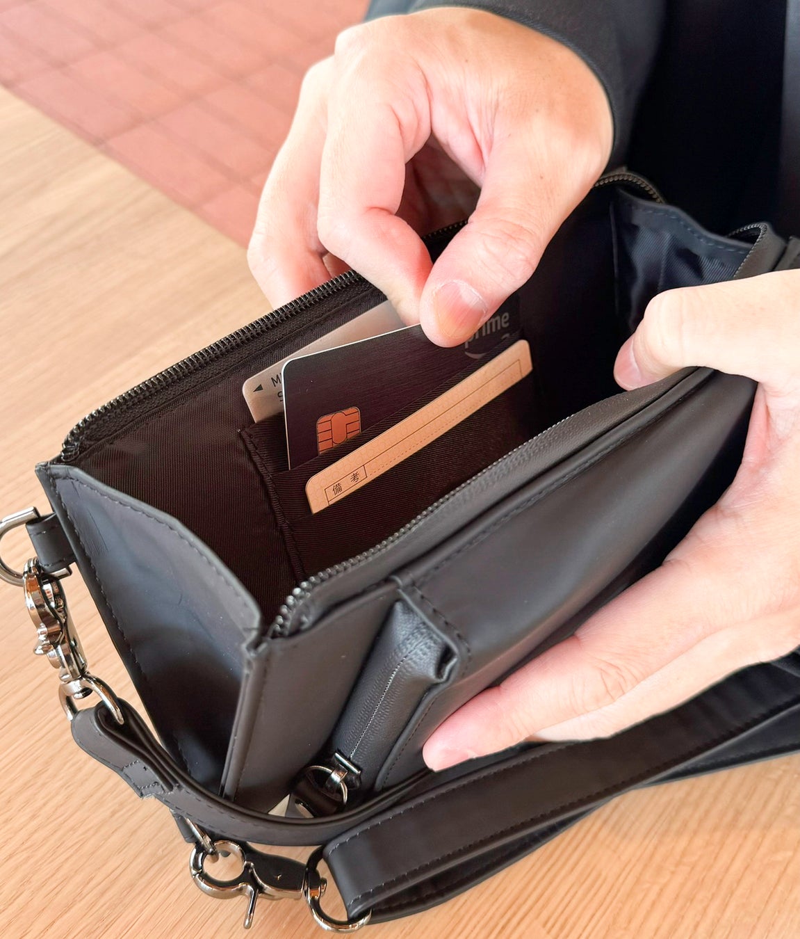 サイドのポケットにお札とクレカ