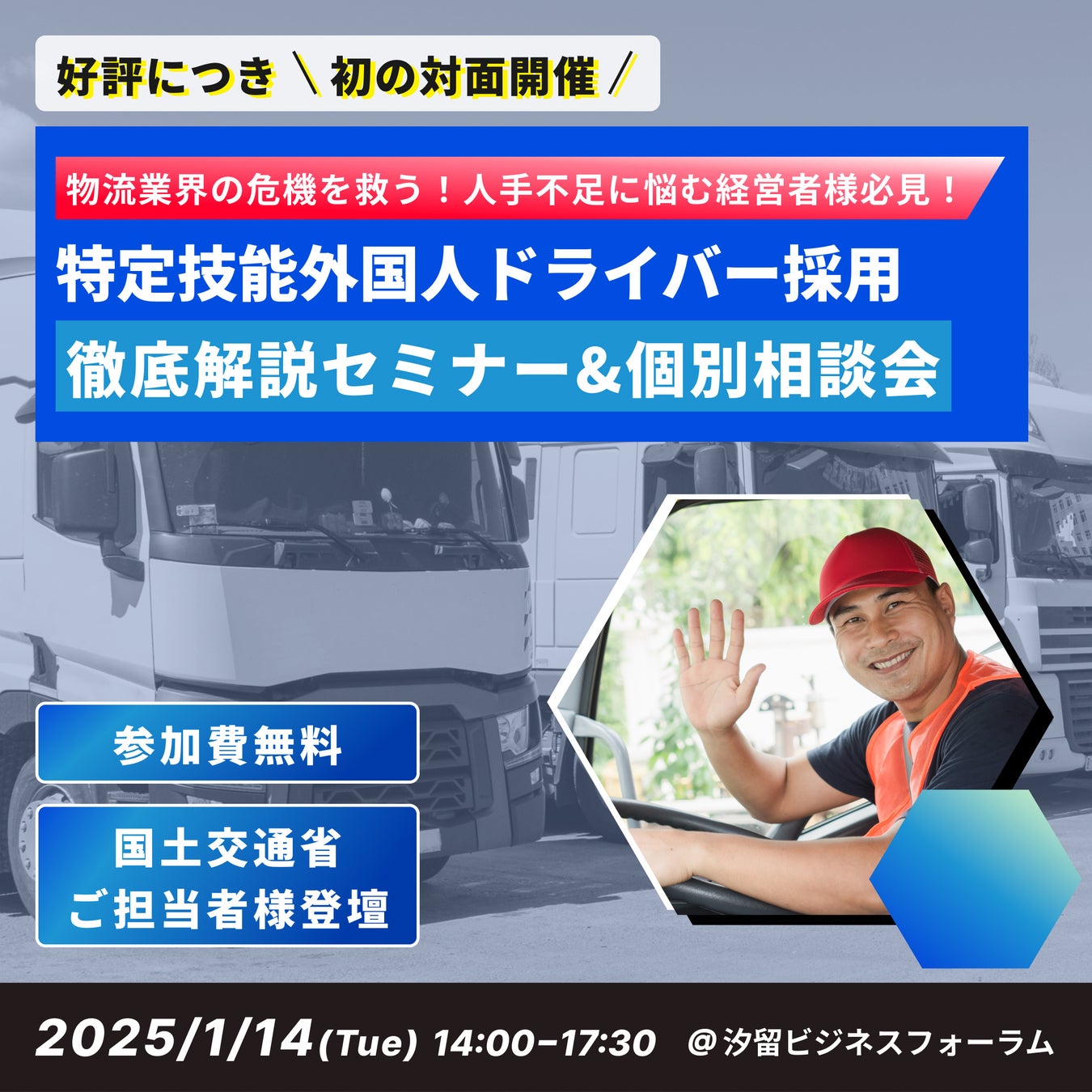 ■1月14日(火)対面形式で「特定技能トラックドライバー外国人人材採用徹底解説セミナー」を開催