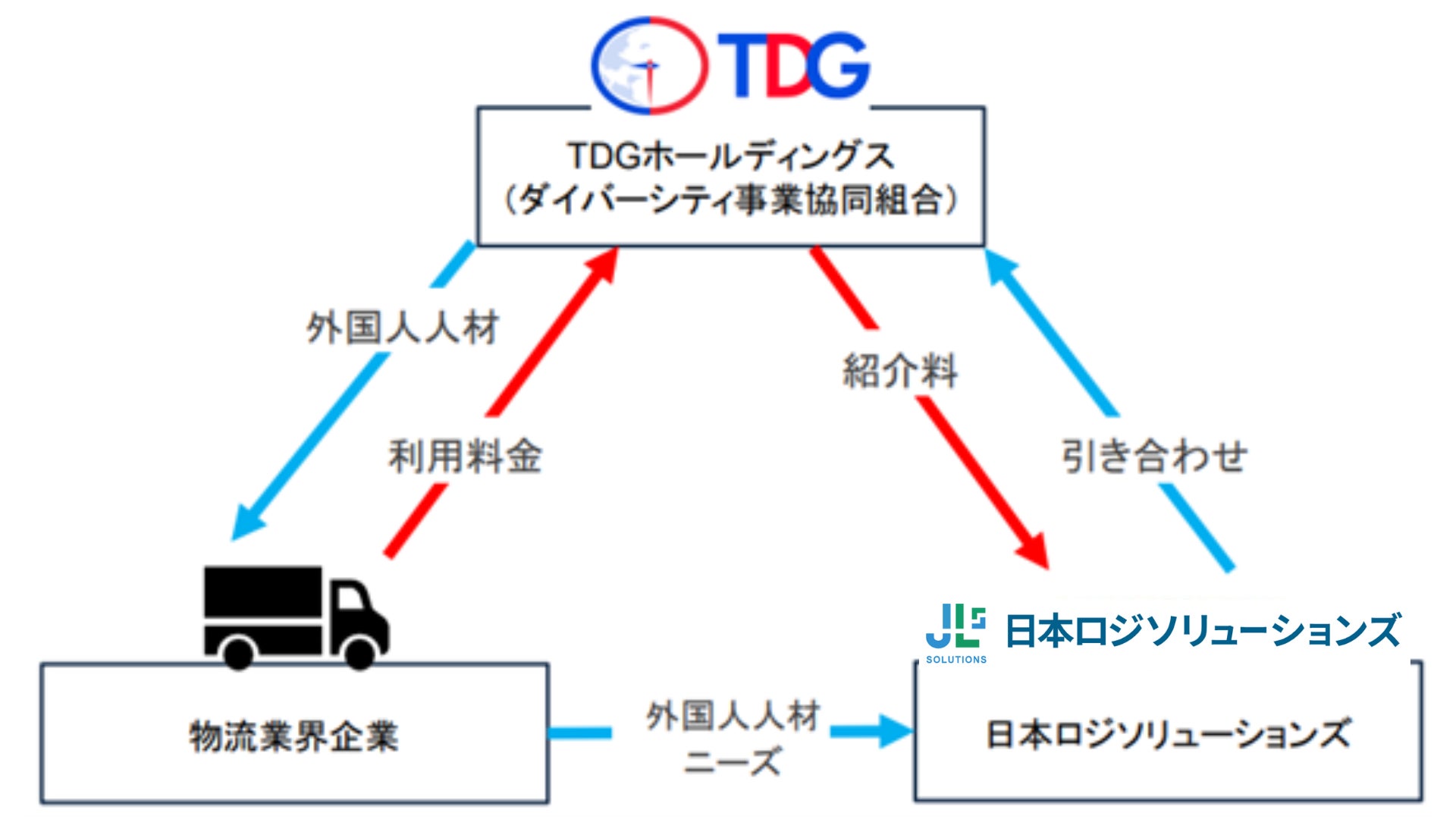 本提携では、物流業界の人材不足という大きな課題を解決するために、日本ロジソリューションズが保有する物流業界企業とのコネクションを活用しながら、TDGホールディングスの外国人人材事業によって、外国人ドライバー人材の育成から企業への紹介までを一気通貫で行うことを目的としています。