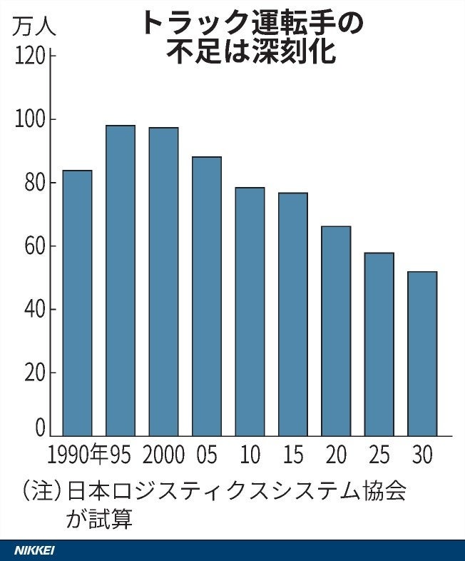 EC市場の発達や宅配の需要増加とは裏腹に、物流業界におけるドライバー人材不足は深刻な問題となっています。その背景には少子高齢化や「物流2024年問題」が挙げられ、2030年には約30万人ものトラックドライバーが不足すると言われており、この課題に対応する施策が急務となっています。