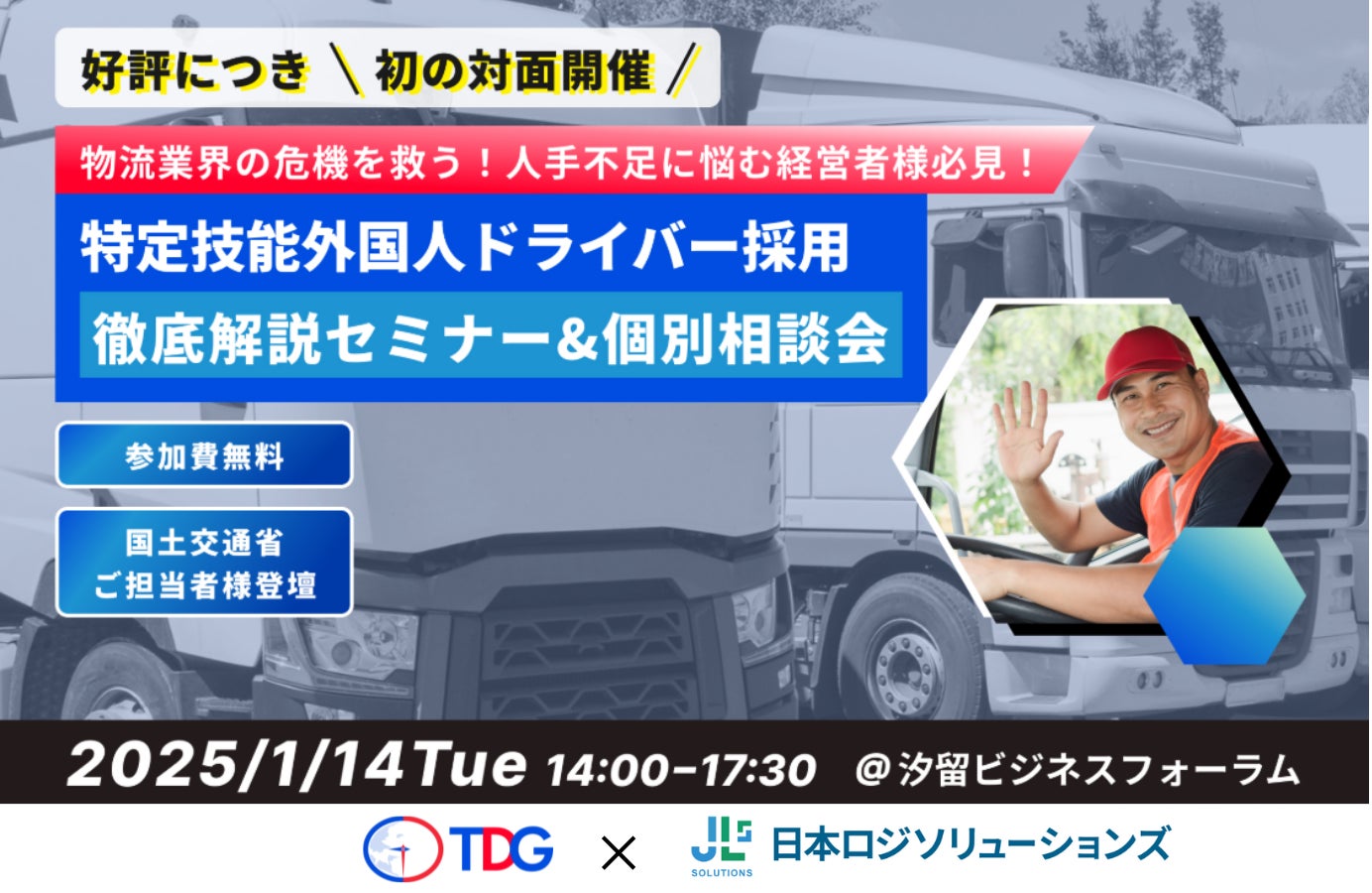 両社のソリューションをより多くの企業様へご提供すべく、2025年1月14日に国土交通省のご担当者様を招聘し「特定技能トラックドライバー外国人人材採用 徹底解説セミナー」を開催いたします。