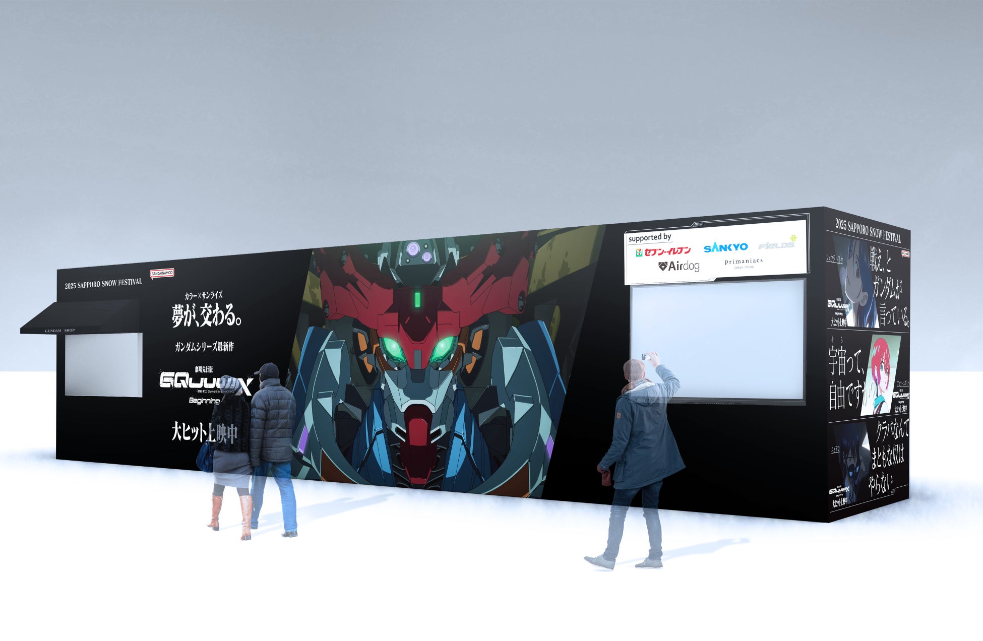現在大ヒット上映中のガンダムシリーズ最新作、劇場先行版『機動戦士Gundam GQuuuuuuX(ジークアクス) -Beginning-』より「GQuuuuuuX(ジークアクス)」雪像とガンダムシリーズ45周年を記念して『機動戦士ガンダム』より「RX-78-2 ガンダム」雪像が横並びで展示され、新旧のガンダムを一挙にお楽しみいただけます。今年は中雪像にサイズアップし、昨年同様フルラッピングされたコンテナでは、北海道の地場企業とタイアップした商品を販売いたします。