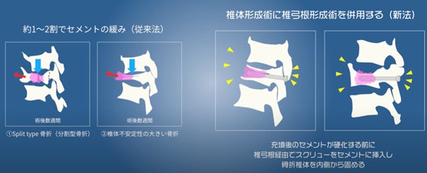 本邦では、高齢者人口の増加に伴い骨粗鬆症性椎体骨折や腰部脊柱管狭窄症等の脊椎疾患に対する治療需要が増加しています。株式会社スパインクロニクルジャパンは高齢化社会で特に治療機会が多い骨粗鬆症性椎体骨折に対して、独自に開発した従来の骨セメント充填方法を改良した『椎体形成用材料』ならびに、脊椎をより強固に内固定を可能とする低侵襲型の『脊椎スクリュー型特殊インプラント』を用いて、脊椎治療の低侵襲化を担保しながら、難治例を含めた患者さんの治療成績の向上ならびFailed back surgery syndrome(手術後に遺残する症状)の発生リスクの軽減を目指します。既存治療方法として、経皮的椎体形成術(骨セメント単独充填術)や脊椎を連結固定する脊椎固定術という手術が広く普及していますが、骨粗鬆症を有する骨粗鬆症性椎体骨折においては、脊椎インプラントや骨セメントの症候性のゆるみ、続発性骨折の発生等により治療が難渋することが課題となっています。本開発品により、これらの課題を解決し、これまで難治化していた患者さんの早期QOL改善、社会生活復帰に貢献し、脊椎治療学の発展に貢献します。