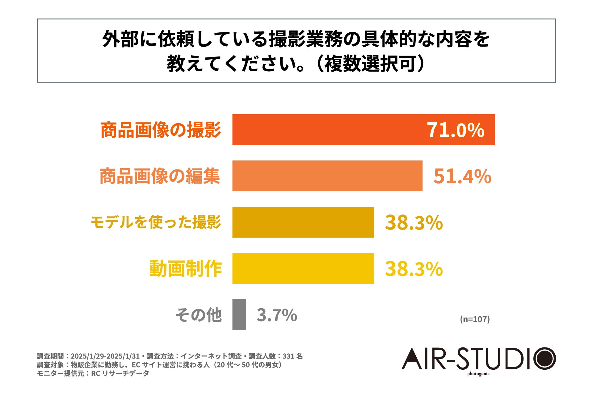また、撮影業務の一部を外部に依頼していると回答された方に「外部に依頼している撮影業務の具体的な内容」を尋ねる設問の回答では、1位が「商品画像の撮影」で71.0%、2位が「商品画像の編集」で51.4%という結果になりました。この結果から、撮影業務の一部を外部に依頼している会社は、撮影関連業務のコア業務である「商品画像の撮影」や「商品画像の編集」を外部に依頼しているケースが多い、ということが明らかになりました。