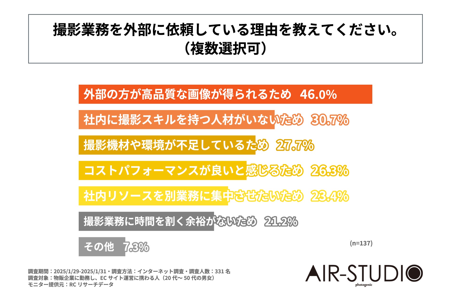続いて、撮影業務の一部、または全てを外部に依頼していると回答された方に「撮影業務を外部に依頼している理由」を尋ねる設問への回答で多かったのは、1位が「外部の方が高品質な画像が得られるため」で46.0%、2位が「社内に撮影スキルを持つ人材がいないため」で30.7%という結果になりました。ここはまさに、撮影業務を全て社内で行っている企業が課題だと感じていることの裏返しの回答が、上位に並ぶ結果となりました。