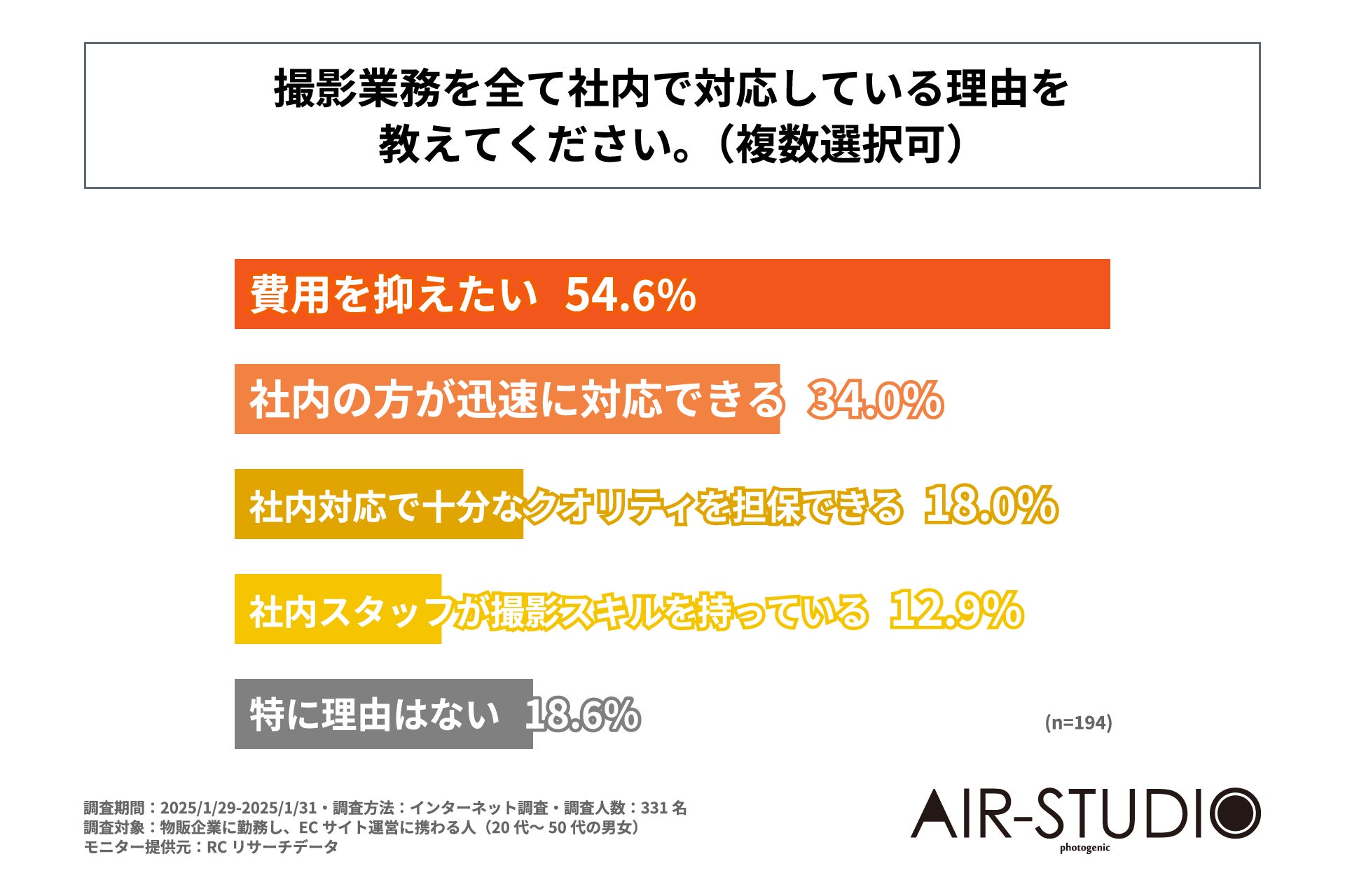 続いて、撮影業務を全て社内で対応していると回答された方に「撮影業務を全て社内で対応している理由」を尋ねる設問への回答では、1位が「費用を抑えたい」で54.6%、2位が「社内の方が迅速に対応できる」で34.0%、3位が「特に理由はない」で18.6%という結果になりました。この結果から、撮影業務を社内で対応している主な理由は「費用を抑えたいから」、「社内の方が迅速に対応できるから」であることが判明しました。