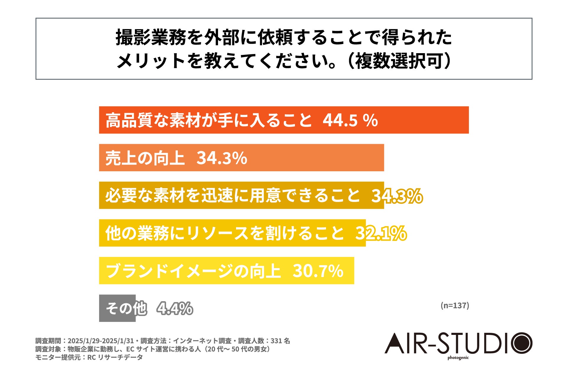 調査の最後、撮影業務の一部、または全てを外部に依頼していると回答された方に「撮影業務を外部に依頼することで得られたメリット」を尋ねる設問への回答で最も多かったのは、1位が「高品質な素材が手に入ること」で44.5%、次いで2位が同率で「売上向上」と「必要な素材を迅速に用意できること」で34.3%、3位が「他の業務にリソースが割けること」で32.1%という結果になりました。撮影業務を全て社内で行う理由の上位に「社内の方が迅速に対応できる」という回答がありましたが、この結果から、撮影業務を外部に依頼することで、高品質な素材が手に入り、それが結果売上向上につながったり、時間の短縮につながると感じている方が数多くいる、ということが明らかになりました。