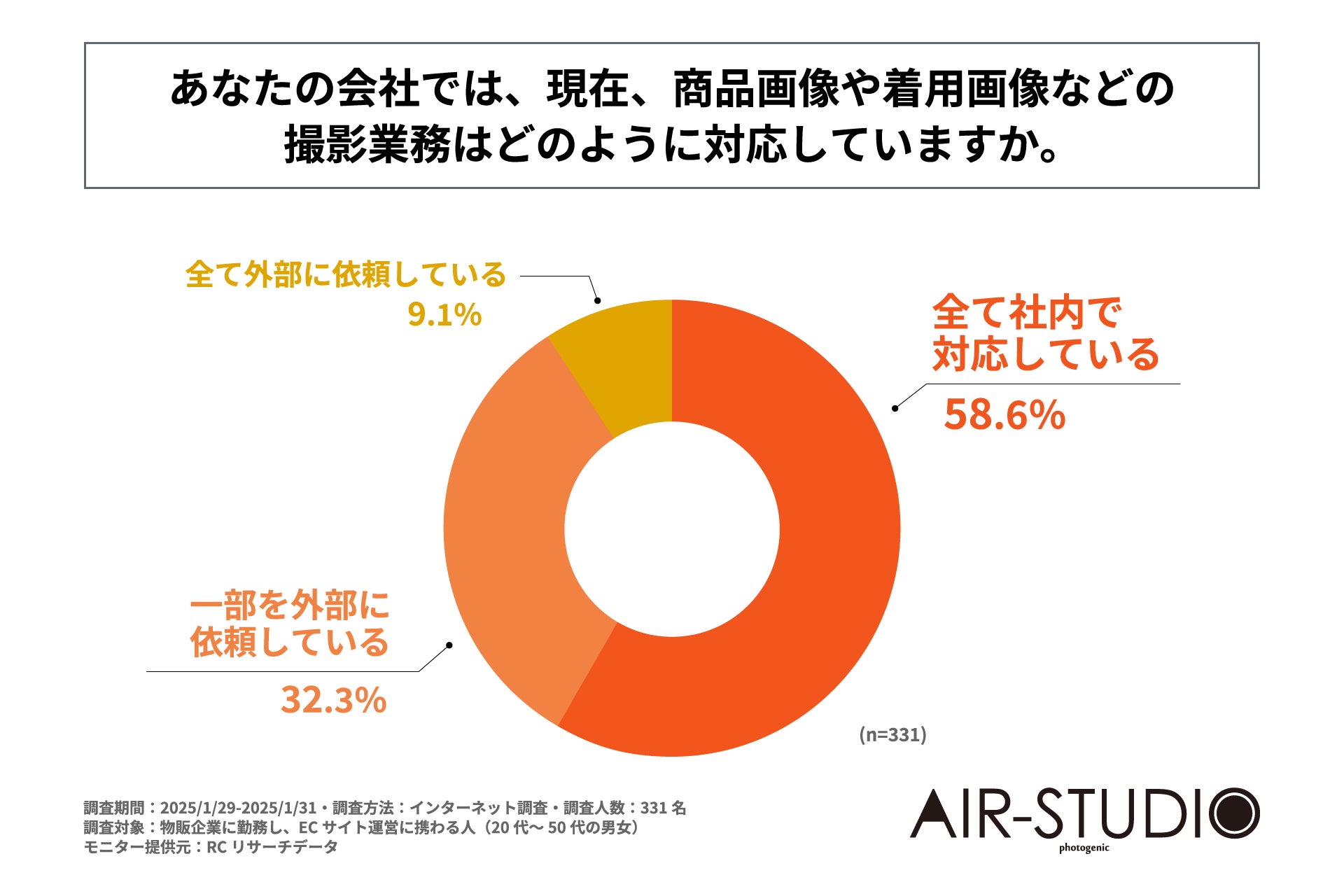 近年、多くの企業がEC市場に参入する一方で、リソース不足や人手不足が課題として浮き彫りになっています。特に、商品画像やプロモーション用素材の制作においては、専門スキルや時間が求められるため、企業内のリソースだけで対応することが難しい状況が増えています。こうした状況下で注目を集めているのが、撮影業務のアウトソーシングです。外部のプロフェッショナルに撮影業務を依頼することで、社内負担を軽減しながら高品質なビジュアルコンテンツを迅速に確保できる点が、多くの企業に支持されています。では、ECサイト運営における撮影業務の課題や、その解決策にはどのようなものがあるのでしょうか。また、実際に撮影アウトソーシングを導入している企業の割合や、その導入による具体的な効果はどのようなものなのでしょうか。そこで、「AIR STUDIO」は、物販企業でECサイト運営に携わる方を対象に、撮影業務に関する実態調査を実施しました。