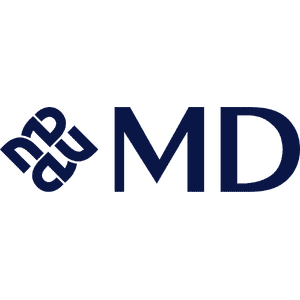 シンボルは社名の「M」と「D」を組み合わせたジオメトリックな造形で構成されています。
