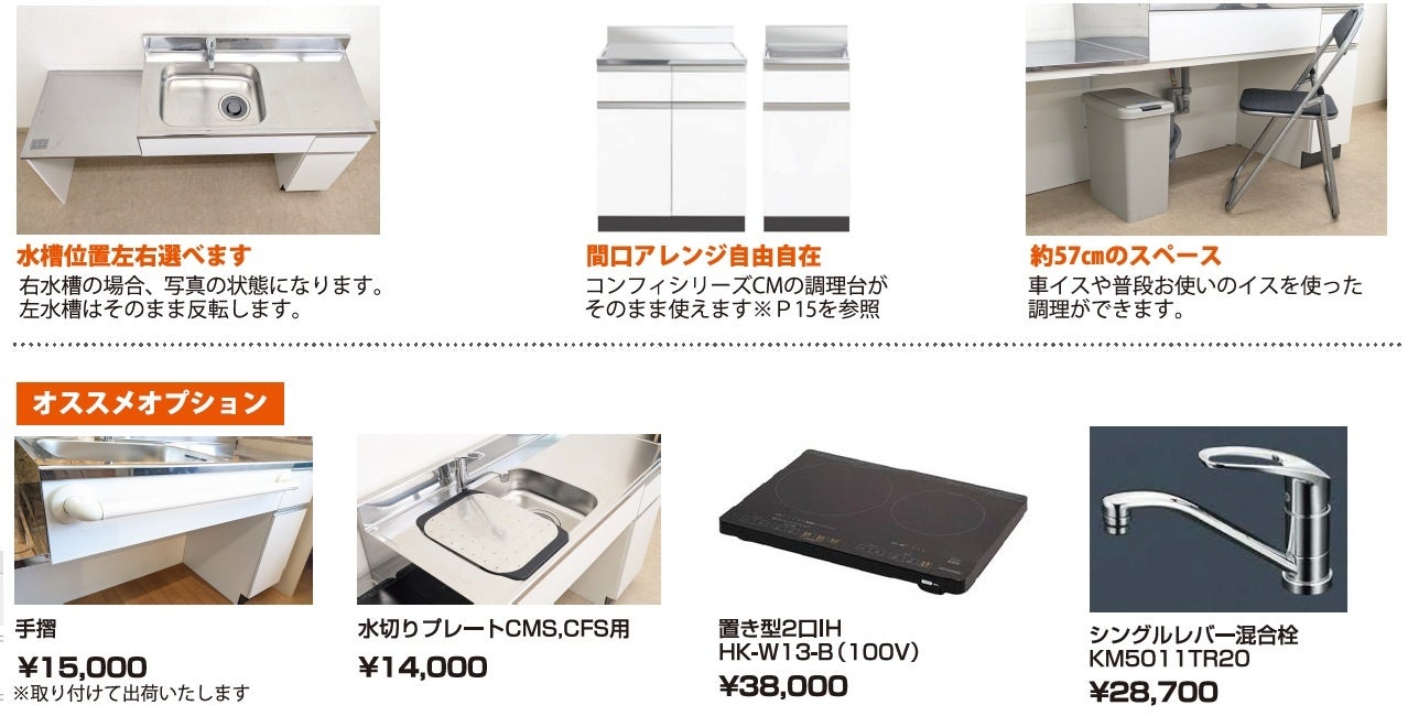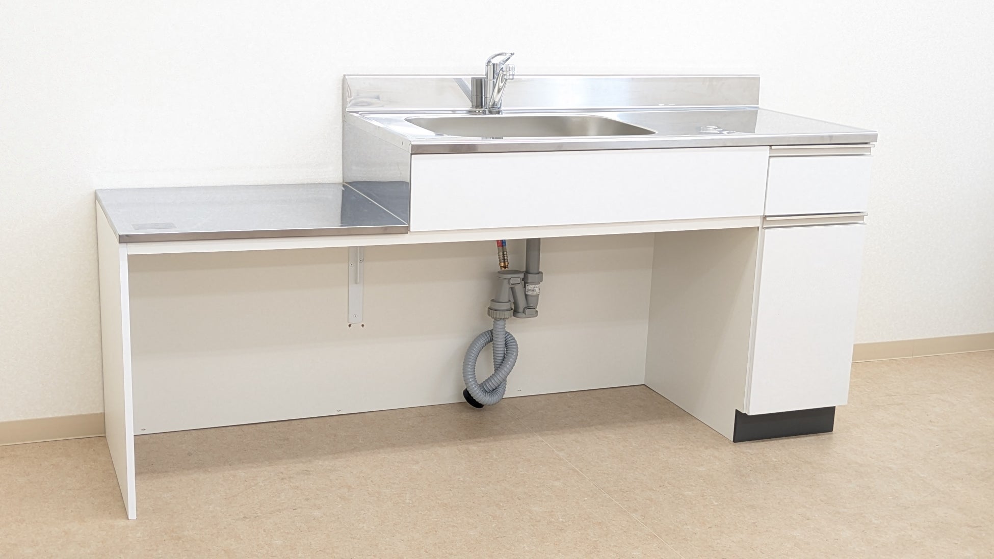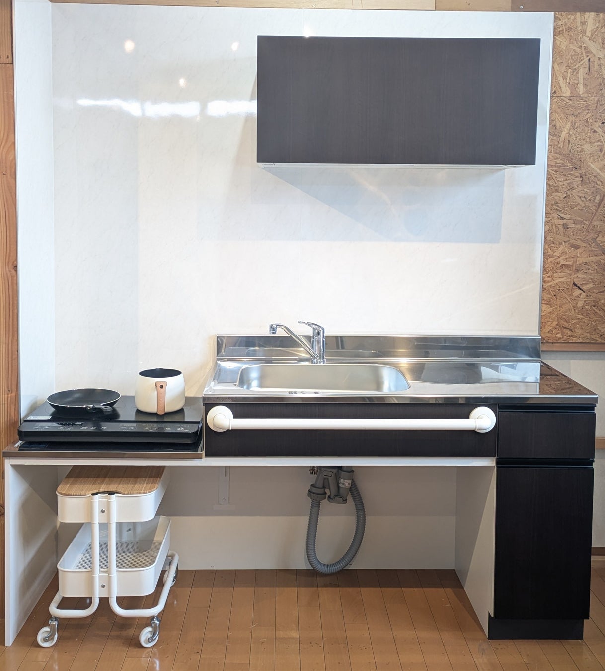 シンクは座っても使いやすい深さ12㎝で、オプションで手摺を取り付けたり、コンロは置き型のガスコンロの他に、IHを設置することも可能です。