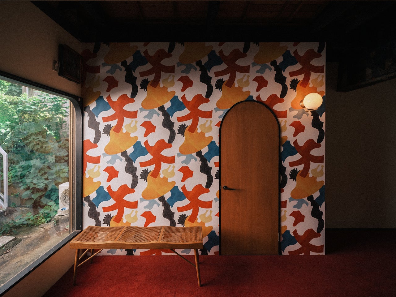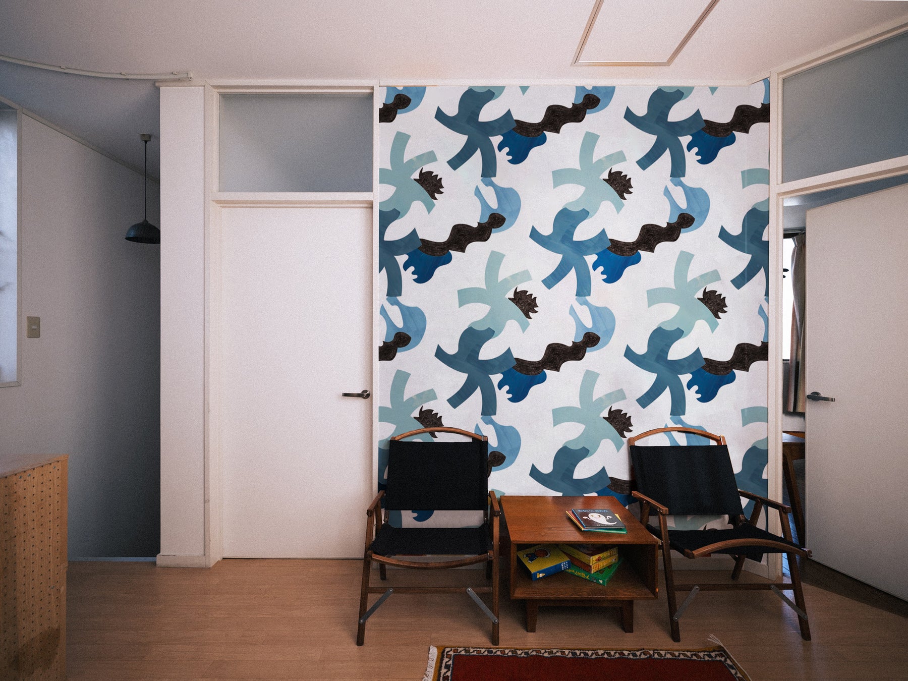 大類さんが実際にテキスタイルの柄を考える時に、水彩絵の具で描くスケッチを集めてできた壁紙です。 その瞬間の心情を映した色選び、即興的な筆の運びが美しく、そのフレッシュな思考の跡をそのままモチーフにしたいと考えました。 三崎を拠点に創作活動をされている大類さんが、三浦・三崎の生活の中で日々感じている色や光が散りばめられています。