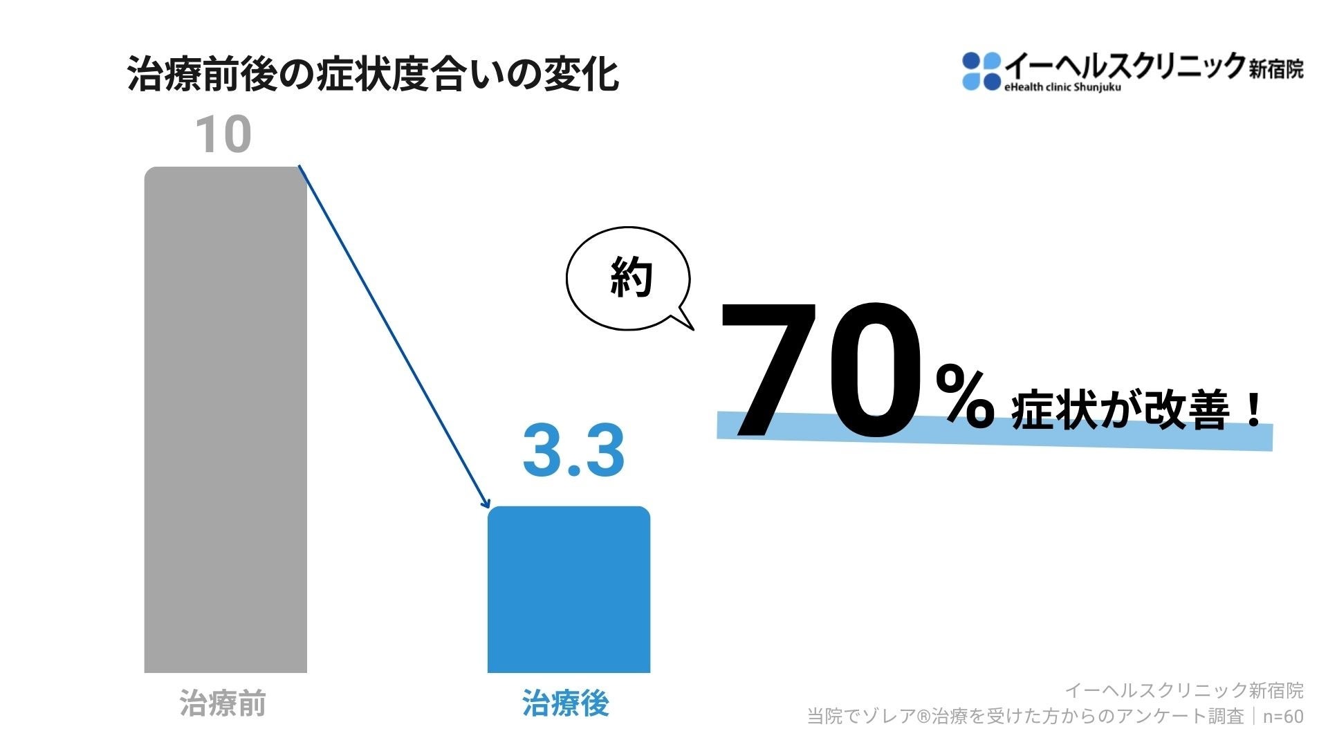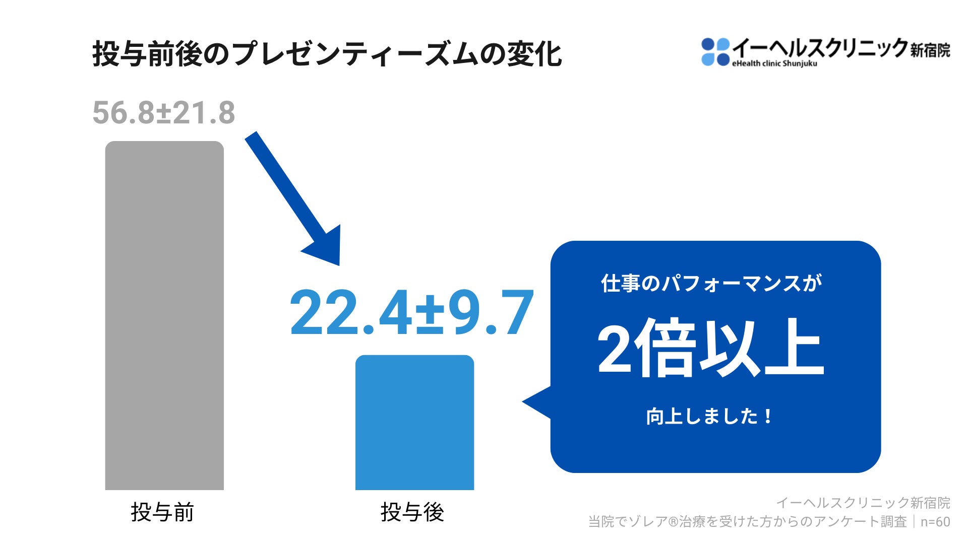 イーヘルスクリニック新宿院での調査結果として、プレゼンティーズム(出勤しているが本来のパフォーマンスが発揮できない状態)が大幅に改善し、患者満足度や治療継続意欲が非常に高いことが明らかになりました。