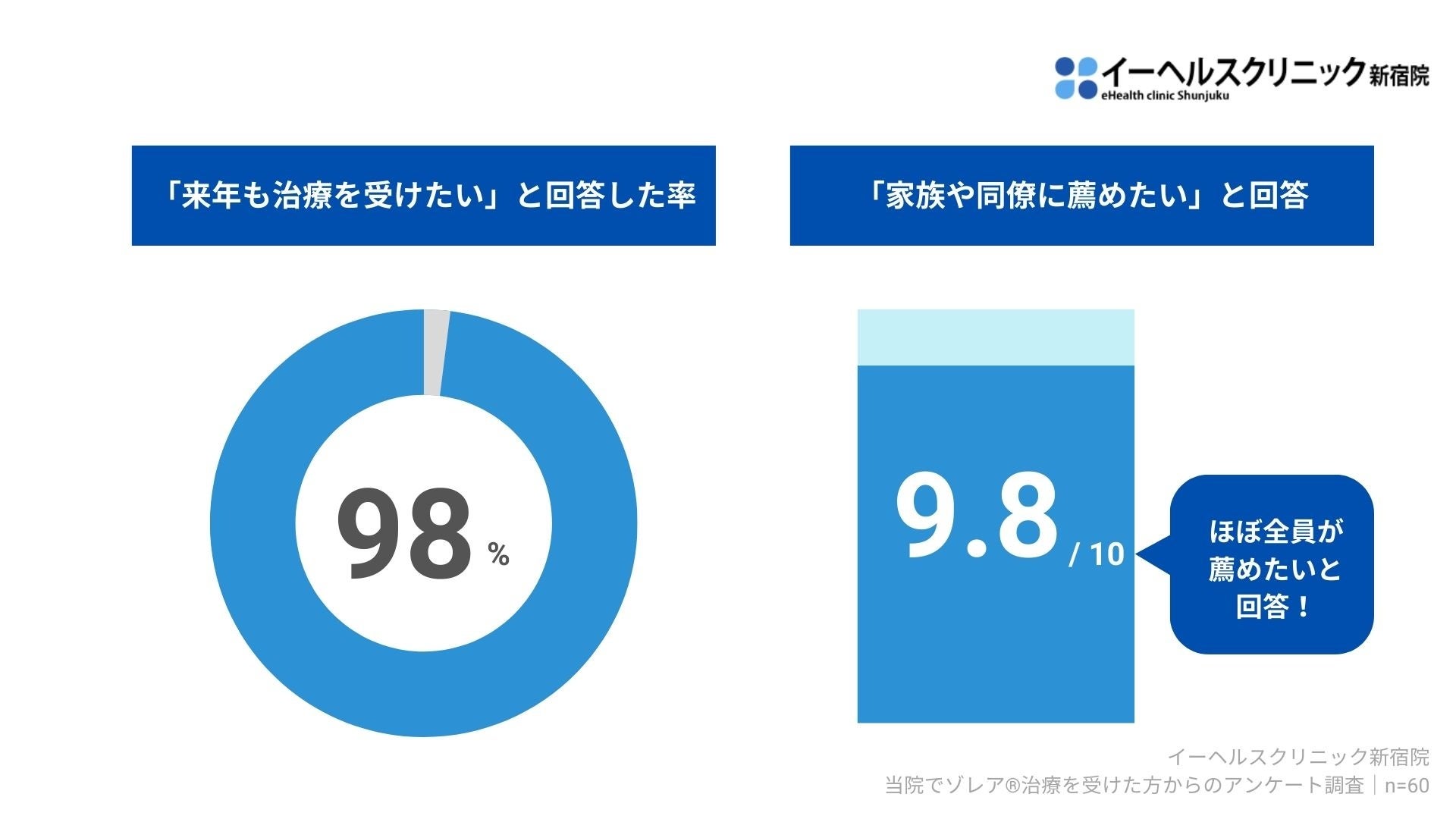 来年も治療を受けたいと答えた人は98%に上り、家族や同僚に薦めたいとの回答は9.8(10点満点中)という結果でした。