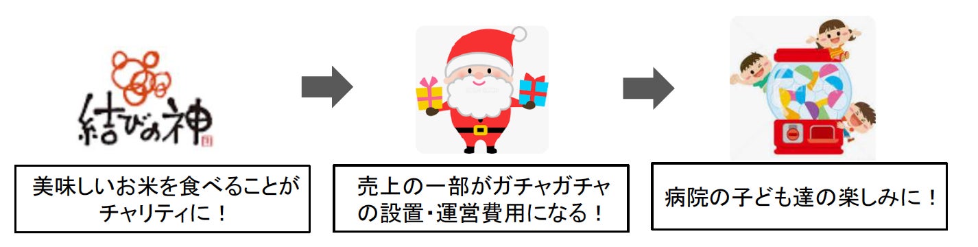 チャリティ米「結びの神」の売上の一部が「ガチャガチャプロジェクト」の 運営資金となります。 単なる寄付活動では無く、寄付者が好むモノを購入し、楽しむことで自然とチャリティに参加出来てしまうというWIN-WINの仕組み。