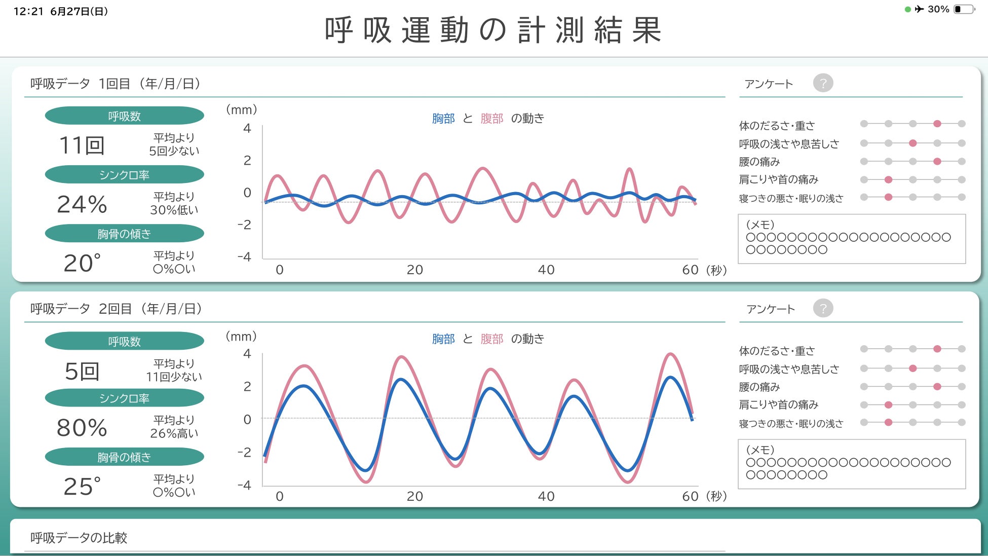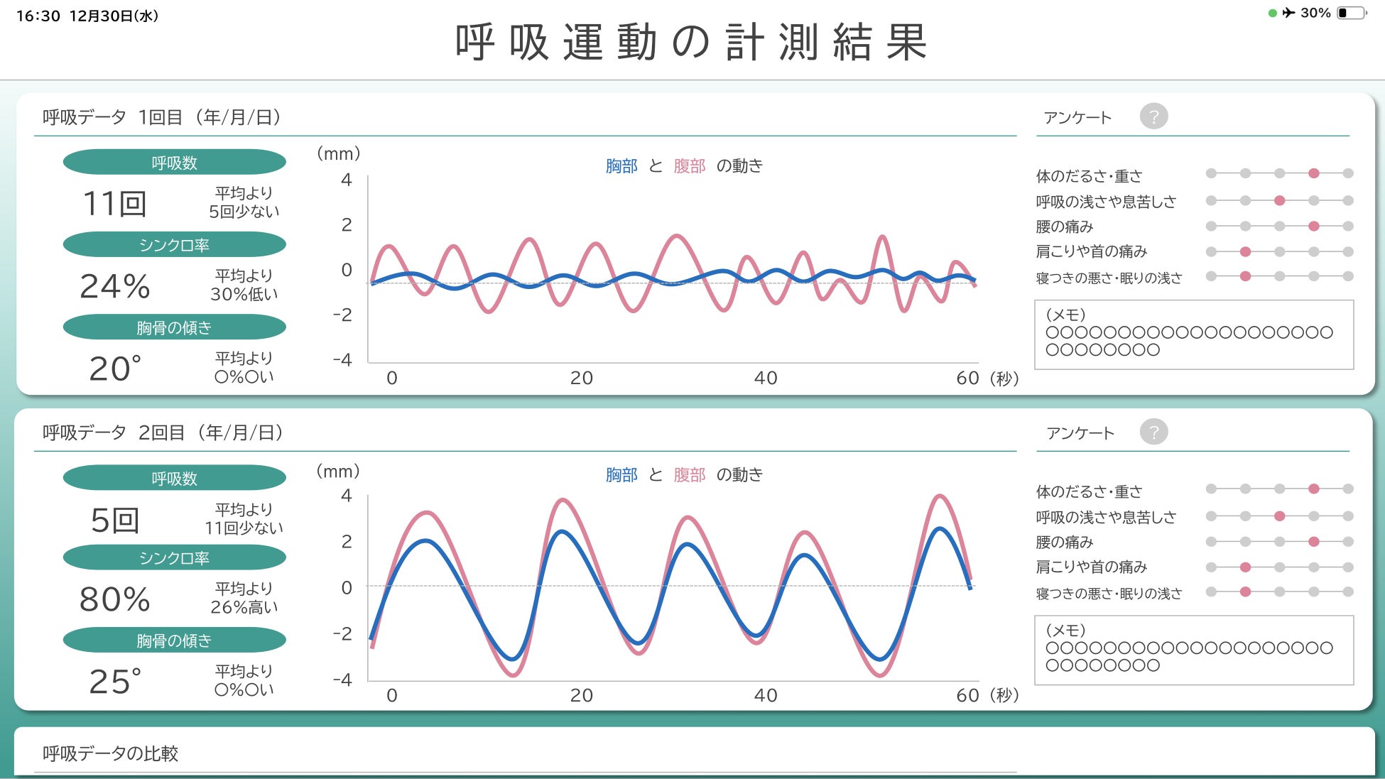 このとき、アプリは計測点を自動で特定(胸とお腹にマークを自動表示)しますので、撮影者はタブレット端末のカメラを利用者にかざすだけで呼吸状態を計測できます。