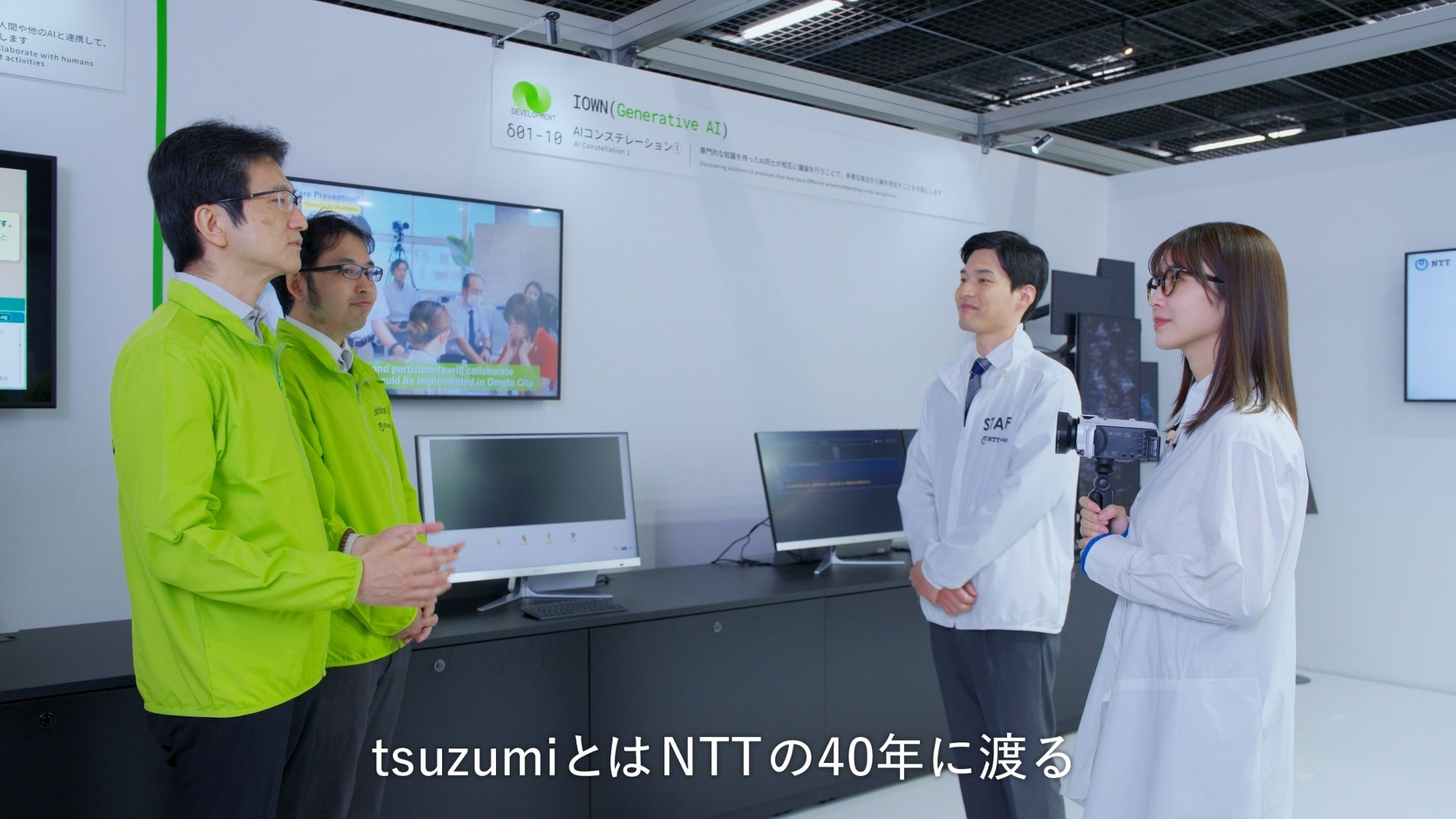最後にAI同士が議論するAIコンステレーションのブースを訪れ、40年にわたるNTTのAIに関する研究に驚きつつ、各専門分野の知識を持つAI同士の会話に加わって「とんこつラーメンの麺の硬さ」を一緒に検討。九州出身である長濱さんもこだわりの麺の硬さの話題で盛り上がりました。(④)