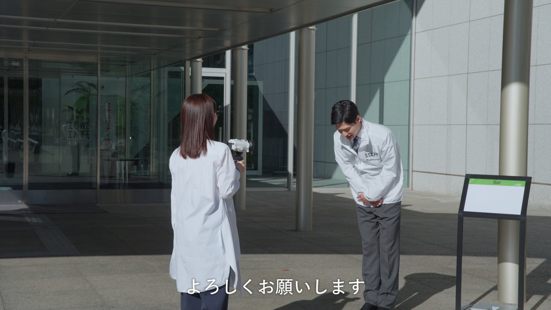 NTTのさまざまな最新技術を取り扱うNTT武蔵野研究開発センタでの撮影に、スタッフ一同、細心の注意と緊張感をもって本番への準備を進める中、一日研究員に扮した長濱ねるさんが現場入り。知性の中に可愛らしさが光る“メガネ姿”のお衣装での登場に、撮影現場は一気に和やかな雰囲気につつまれ、終始笑顔がこぼれる中で撮影はスムーズに進みました。
