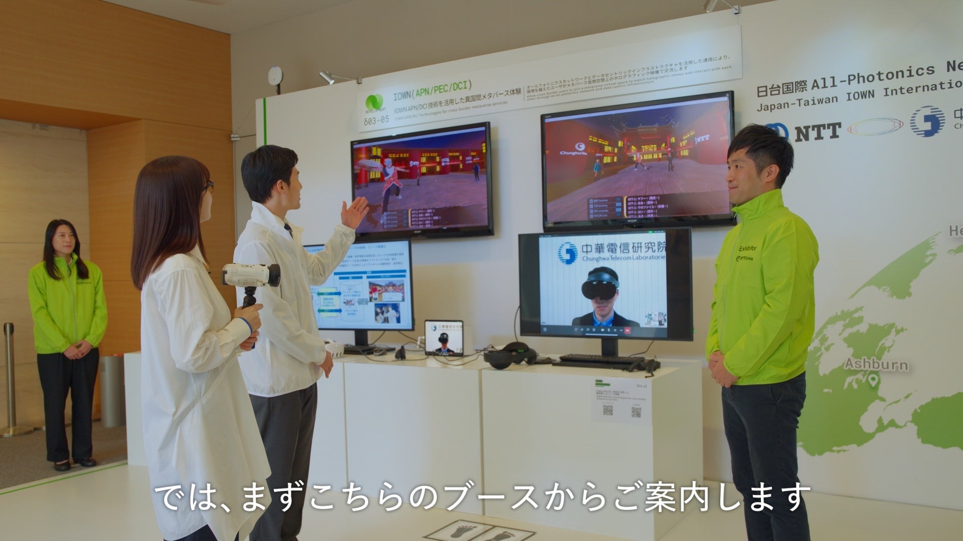 はじめに訪れたのはIOWN APN -台湾連携-のブース。これは先日開通した世界初のIOWN国際間APNでつながっているメタバース空間です。超低遅延で台湾の現地スタッフとのコミュニケーションをスムーズな同時翻訳により、言語の壁を超えながら楽しみます。(②)