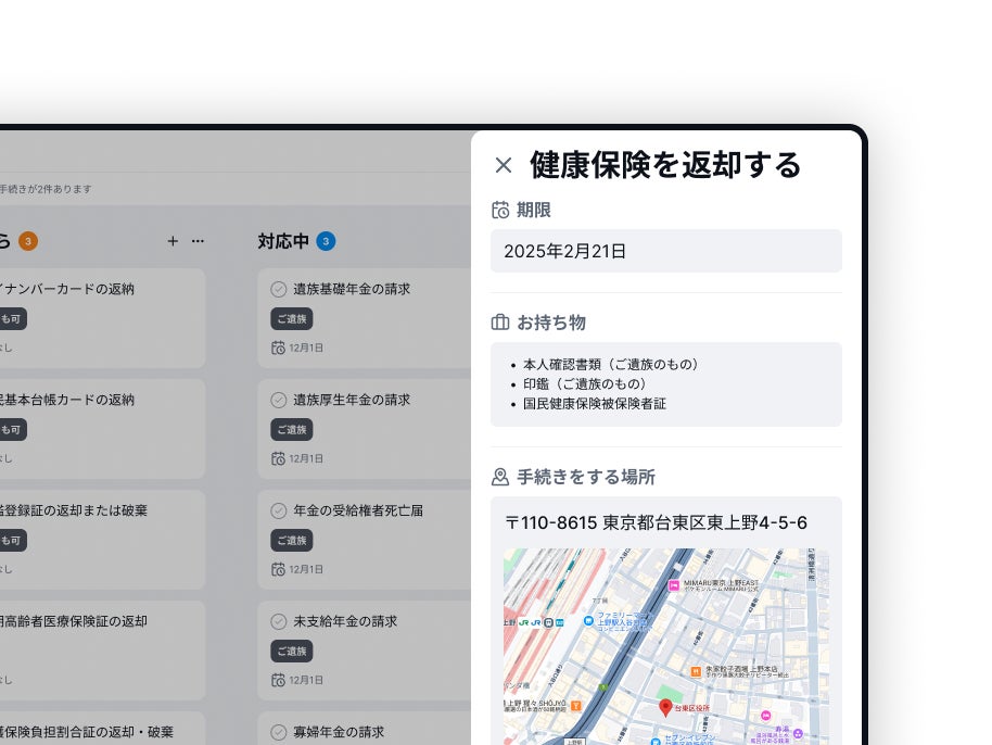 状況に応じて『するべきこと』と『しなくて良いこと』をわかりやすく整理。 チャットを通じて進捗を管理し、タスクを『これから』『完了』として随時更新。特に、納税申告期限である死亡後10ヶ月以内に必要な手続きをすべて完了できるよう、しっかりサポートします。