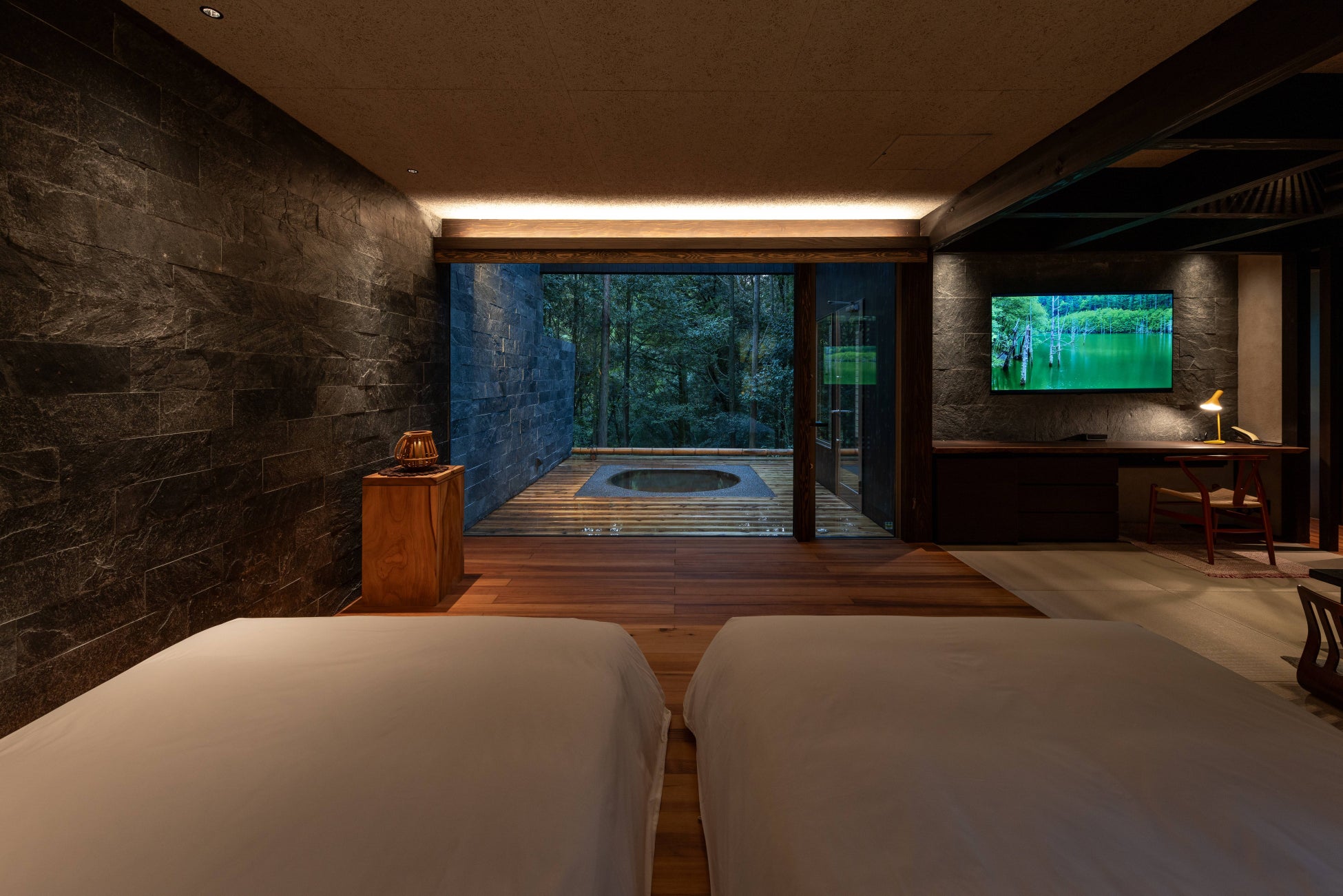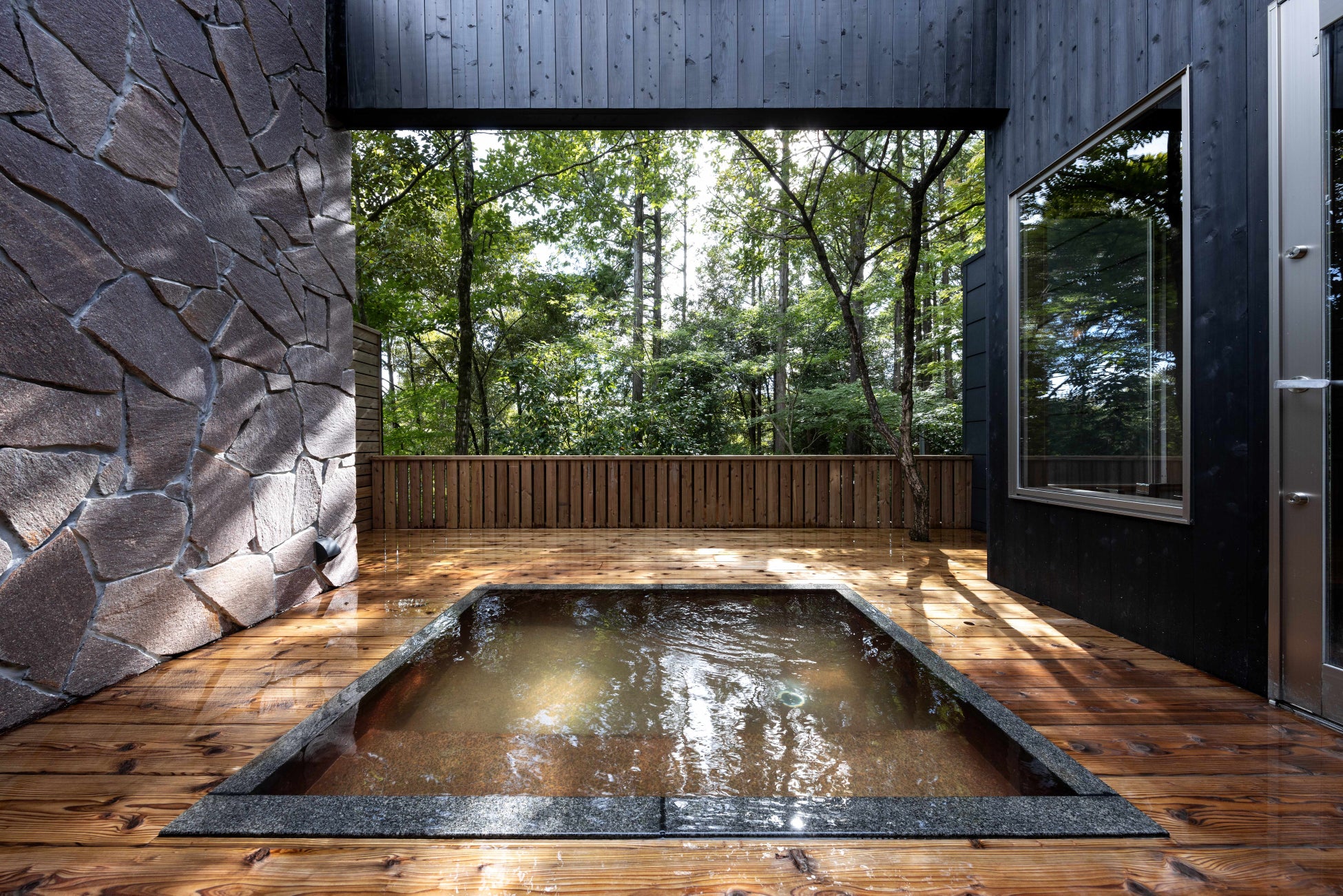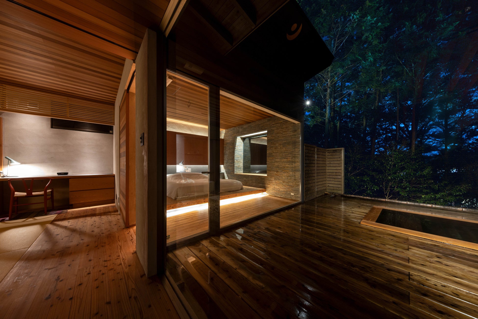 まさに大人の隠れ家のように、森に囲まれた部屋。目の前には檜の森があり、せり出した露天風呂が森の深さを感じさせてくれます。