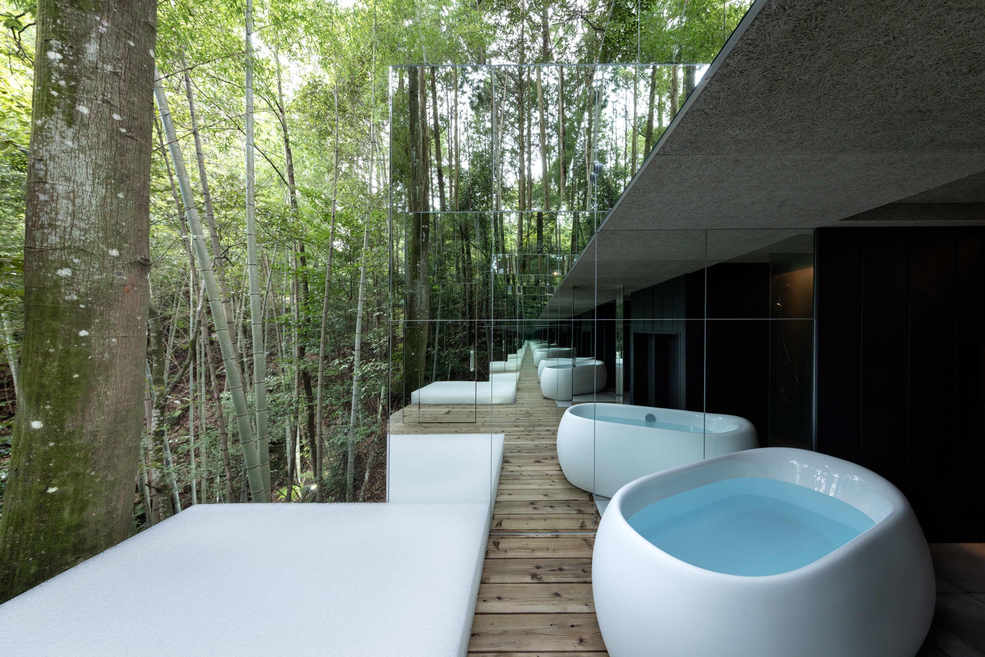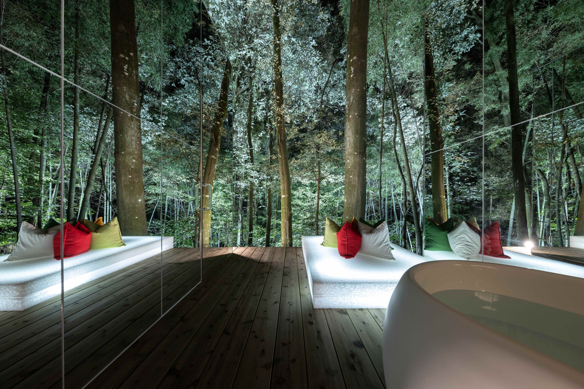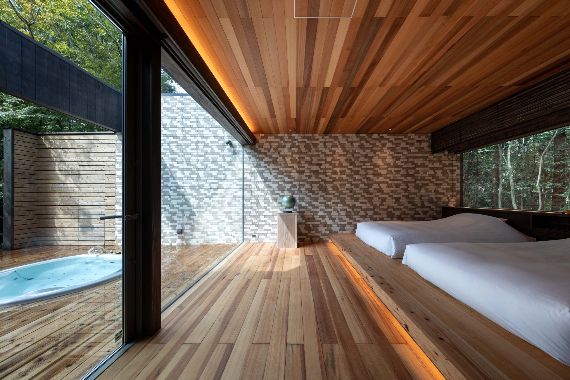 まさに大人の隠れ家のように、森に囲まれた部屋。目の前には檜の森があり、せり出した露天風呂が森の深さを感じさせてくれます。