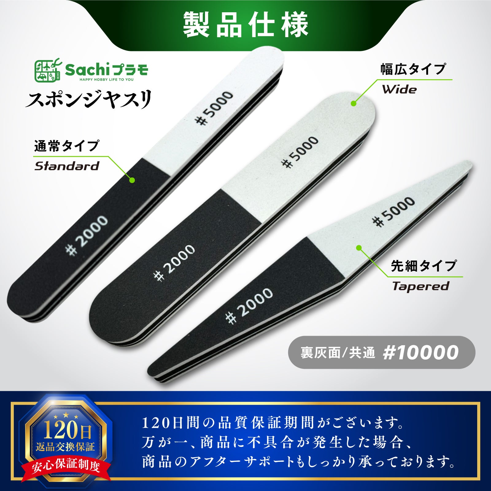 また、厚みがあるのも「VERTスポンジ」の大きな特長。持ちやすく力がしっかり入るので削りやすさが抜群と、プロモ系YouTuberからも驚きの声が寄せられています。つや消し・つや出し・光沢仕上げも自由自在。#2000・#5000・#10000と3つの番手で、思いのままの仕上がりが叶います。