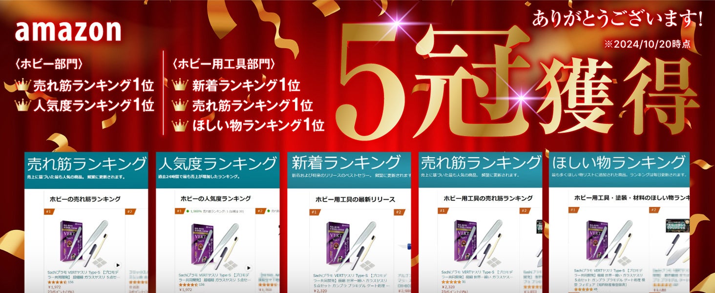 数あるラインナップの中でも、特に優れた性能・品質のアイテムだけに冠しているシリーズ名が、VERT。2023年9月に発売したガラスヤスリ「VERTヤスリ」は、プラモパーツをゲートからニッパーで切り出した後、VERTヤスリ1本だけで作業を完結できるという画期的な商品です。削った後の研磨面が非常にキレイなので、鉄ヤスリや紙ヤスリなどを使うことなくそのまま塗装が可能。プラモの常識を覆すアイテムだと、30~50代の男性を中心に反響を呼び、Amazonホビー用工具売れ筋ランキングNO.1を達成しています。