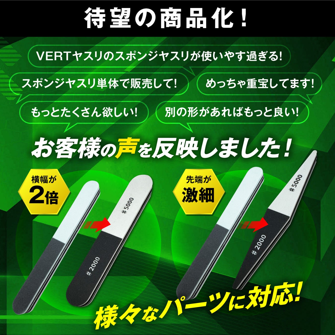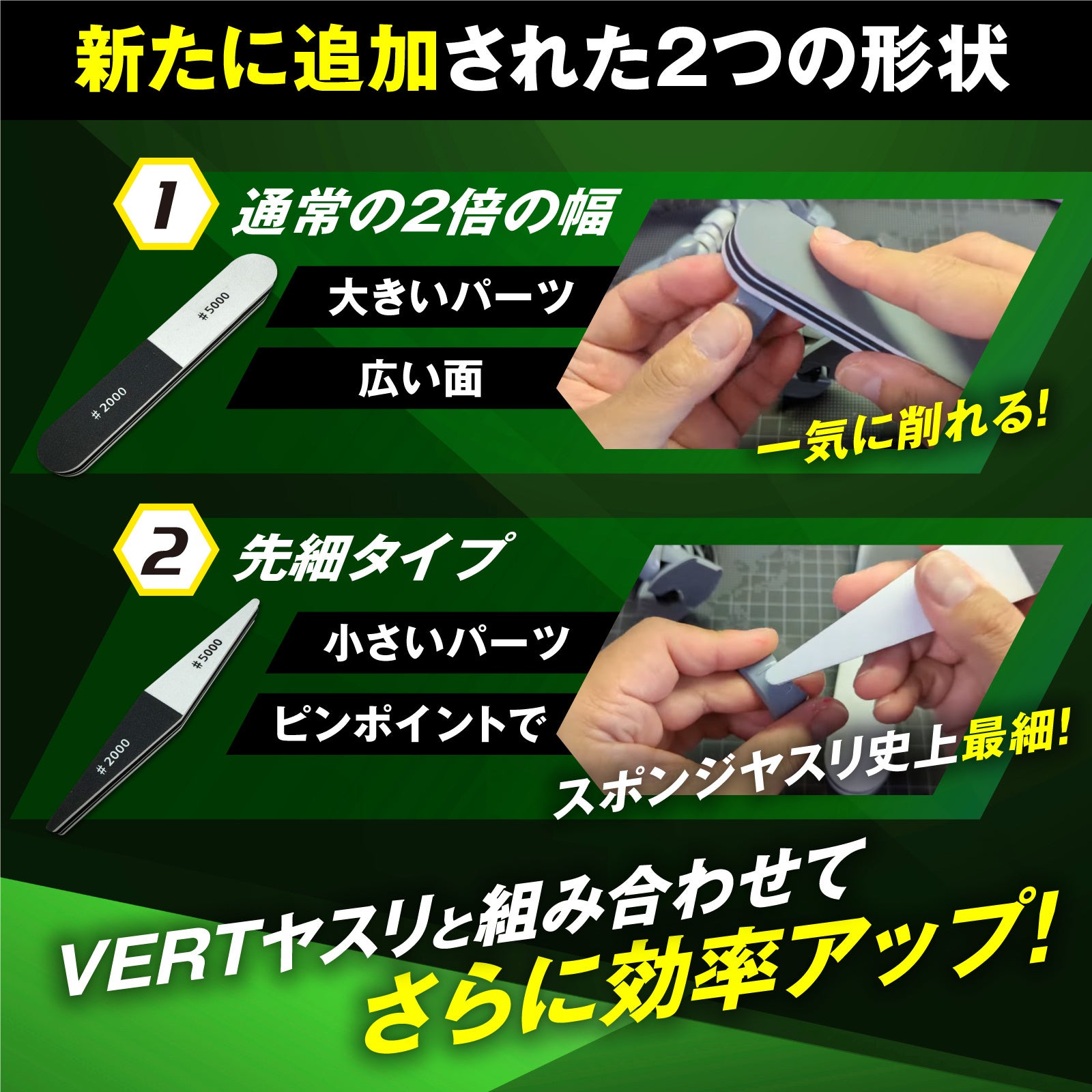 「VERTスポンジ」で新たに追加されたのは、2つの形状です。幅広タイプは、横幅が“通常の2倍”。大きいパーツや広い面も一気に削れ、作業時間を大幅に短縮します。先細タイプは、スポンジヤスリ史上“最細”(自社調べ)。激細の先端部分で、小さいパーツや狭い箇所もピンポイントで美しく削れるため、納得の出来栄えを実現します。
