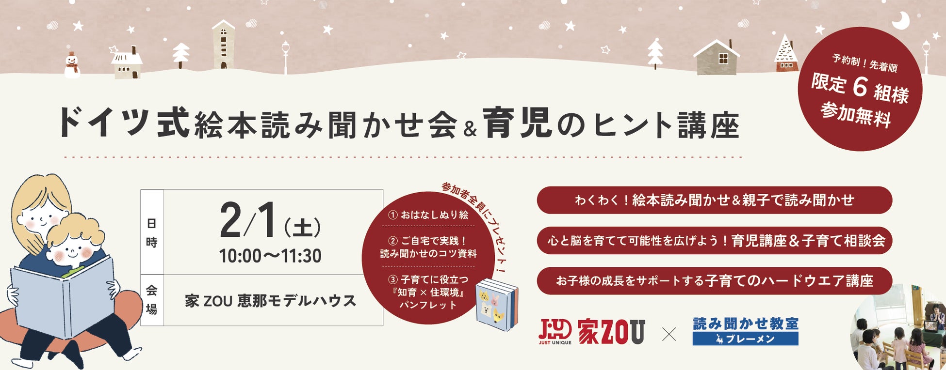 岐阜県土岐市で、新築注文住宅やリフォーム・増改築など、建築工事を手掛ける株式会社 家ZOU(取締役社長:大島 祐一)は、地域の子どもたちが夢と希望を持って健やかに育つ環境づくり支援のため、絵本の読み聞かせイベントを開催いたします。