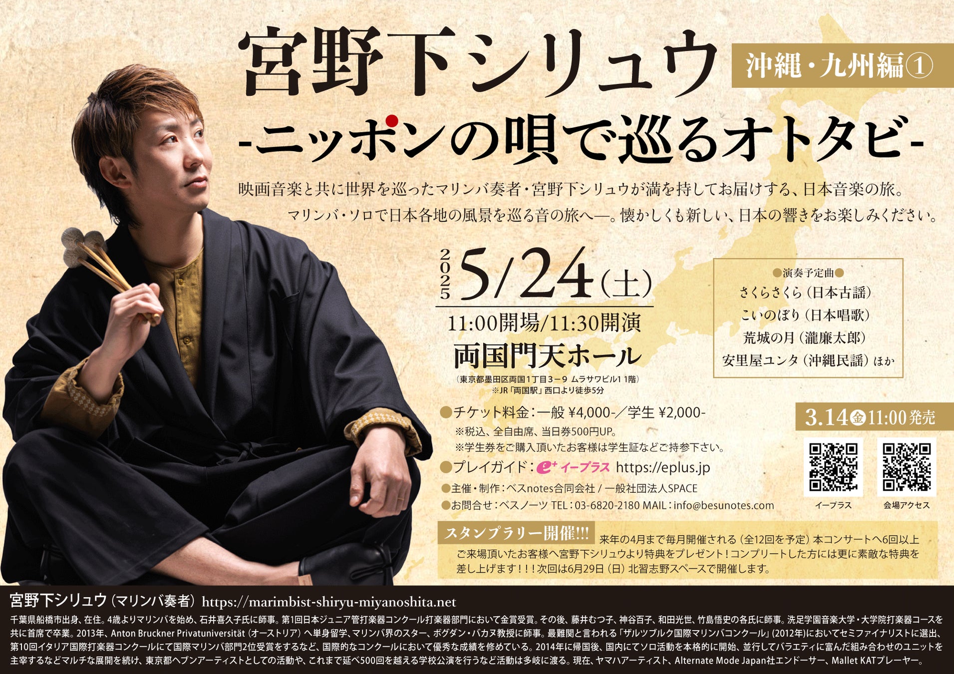 映画音楽で巡る世界旅行をテーマに、2024年に東名阪ツアーを成功させたマリンバ奏者 宮野下シリュウの「オトタビ」プロジェクト。今年は日本を音楽と共に旅する「ニッポンの唄で巡る-オトタビ-」を2025年5月より始動する。47都道府県の民謡や唱歌等をマリンバで奏で、東京・千葉を拠点に月一回の“音楽旅行”を展開。マリンバ奏者「宮野下シリュウ」が満を持して贈る、日本音楽文化の再発見プロジェクトがいよいよ開幕します。