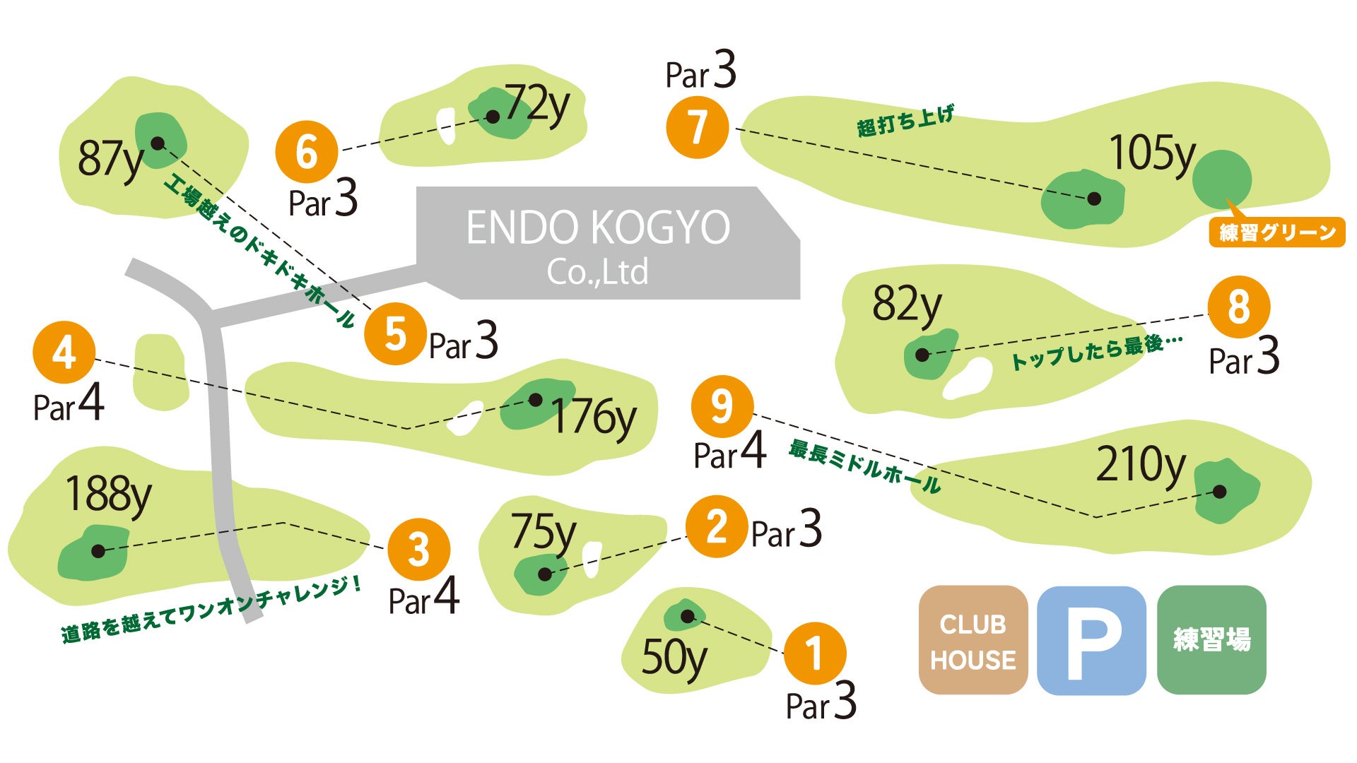 パー4のミドルホールのグリーン近くにティーを設け、パー3にして初心者が一緒でも回り易くする『エンジョイパー3』、NO-7とNO-8ホールの間に、コース利用中アプローチ練習が出来る『アプローチ練習エリア』の増設など、お仕事の合間や余暇の一部を利用して、お一人様でもグループでも1周9ホール、1時間ちょっとで、ウッド、アイアン、アプローチ、パッティングと一通りのゴルフがお楽しみいただけます。ニッチなお楽しみ空間の場をご提供致します。勿論、一日回り放題でとことん打ち込むことも出来ます。