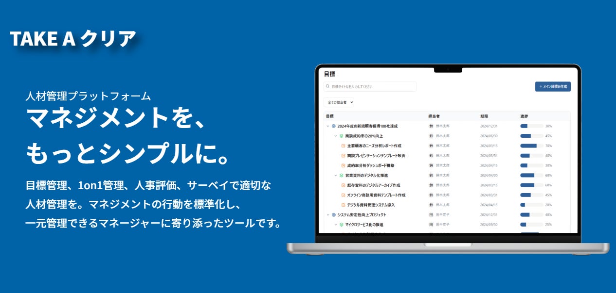 目標管理、1on1管理、人事評価、サーベイで適切な人材管理を実現「TAKE A クリア」の事前登録開始