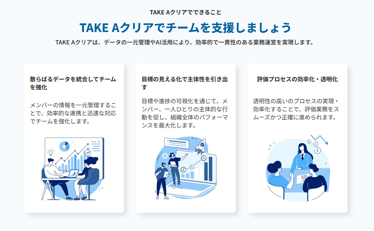 「TAKE A クリア」は、目標管理、1on1管理、人事評価、サーベイなどの機能を通じて、効率的で透明性の高い人材管理を実現します。