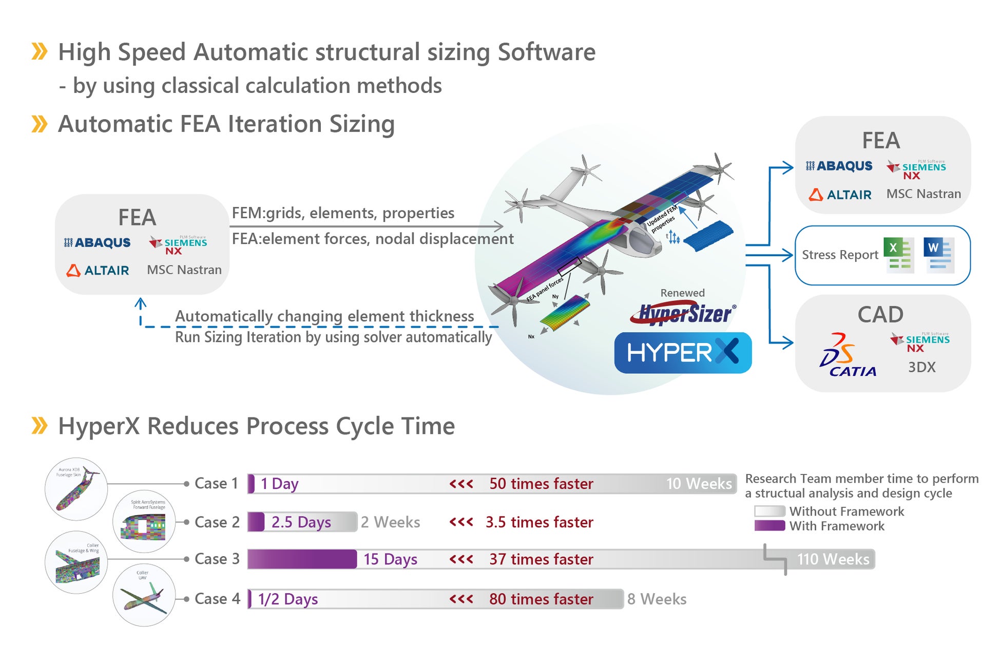 HyperX(旧HyperSizer)は、米国Collier Aerospace社がNASAラングレー研究所で開発されたソフトウェアプログラムをベースに開発した有限要素モデル(FEM)を使用した、構造寸法自動サイジングソフトウェアです。従来の金属や複合材の強度計算手法をソフトウェア化したもので、FEMモデルをベースにストレスエンジニアが強度計算や構造ストレスサイジングを瞬時に行うことができ、設計プロセスにかかる時間とコストを大幅に削減することができます。