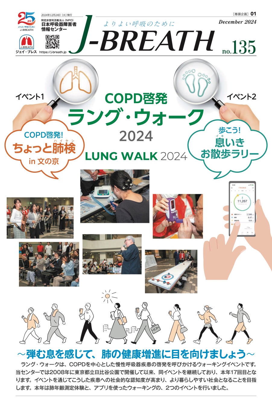 J-BREATH(NPO法人日本呼吸器障害者情報センター)は、COPD(シー・オー・ピー・ディー)や間質性肺炎などの慢性呼吸器疾患患者さんとその家族のための、患者支援団体=患者会で、2000年に創設されました。患者さんがより良い療養生活を送れるよう、電話による悩み相談のほか、会報紙「J-BREATH」を通じて、療養関連情報を提供し、医療講演会やイベントによる疾患啓発活動を行っています。また、日本呼吸器学会及び他の呼吸器疾患患者団体と連携・協働して患者さんの声(意見・要望)を集めてより良い療養環境を整えるための国への陳情活動などを行っています。