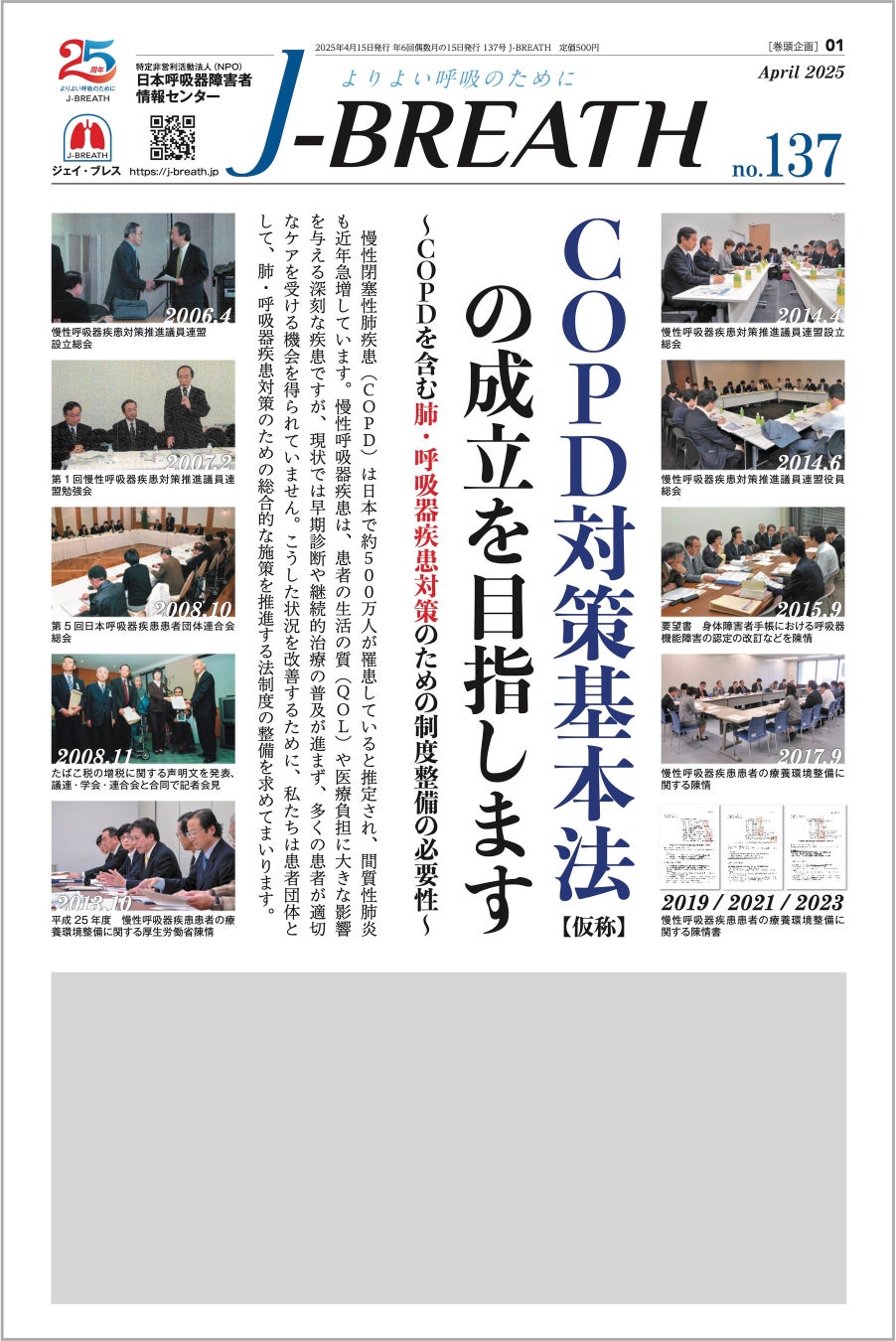 NPO法人 日本呼吸器障害者情報センター J-BREATH(所在地:東京都文京区、理事長:遠山和子 以下「J-BREATH」)は、2025年4月30日、肺・呼吸器疾患対策のための制度整備に向けて、「COPD対策基本法(仮称)」の成立を求める声明を発表しました。