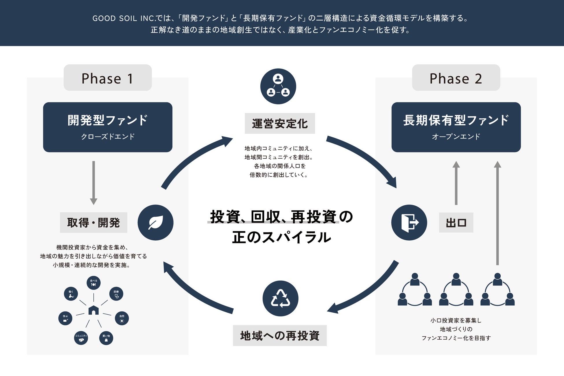 GOOD SOIL INC.では、「開発ファンド」と「長期保有ファンド」の二層構造による資金循環モデルを構築します。