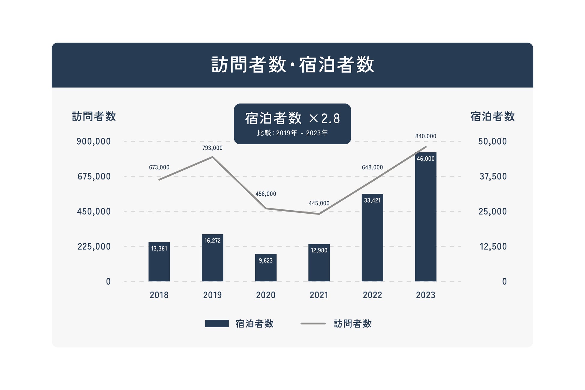小さな開発を積み重ねることで、地域の魅力が多面的に発信され、国内外からの来訪者が増加。瀬戸田では来訪者のインバウンド比率が40%に達し、宿泊者数も伸び続けています。また、インバウンドのうち80%が欧米豪からの来訪者であることも全国平均と比較して特異な点です。