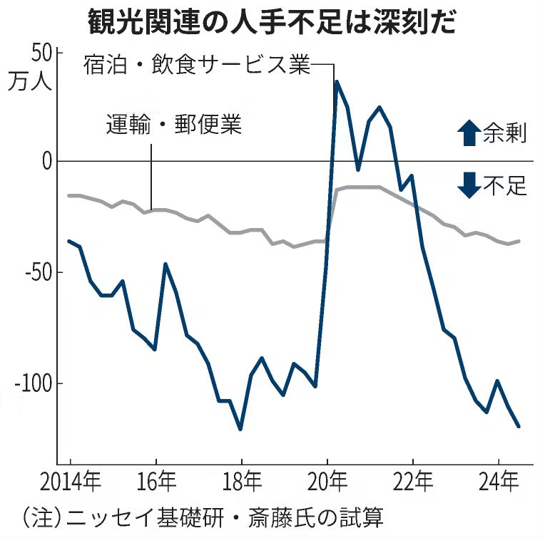 訪日観光客が2019年を上回るペースで回復し、日本政府は2030年までに6000万人の訪日客の目標を掲げています。しかし、観光産業では人手不足が深刻化し、宿泊・飲食業界では約120万人の労働力が不足している状況です((注)ニッセイ基礎研・斉藤氏の試算 / 日本経済新聞、2025年1月15日)。