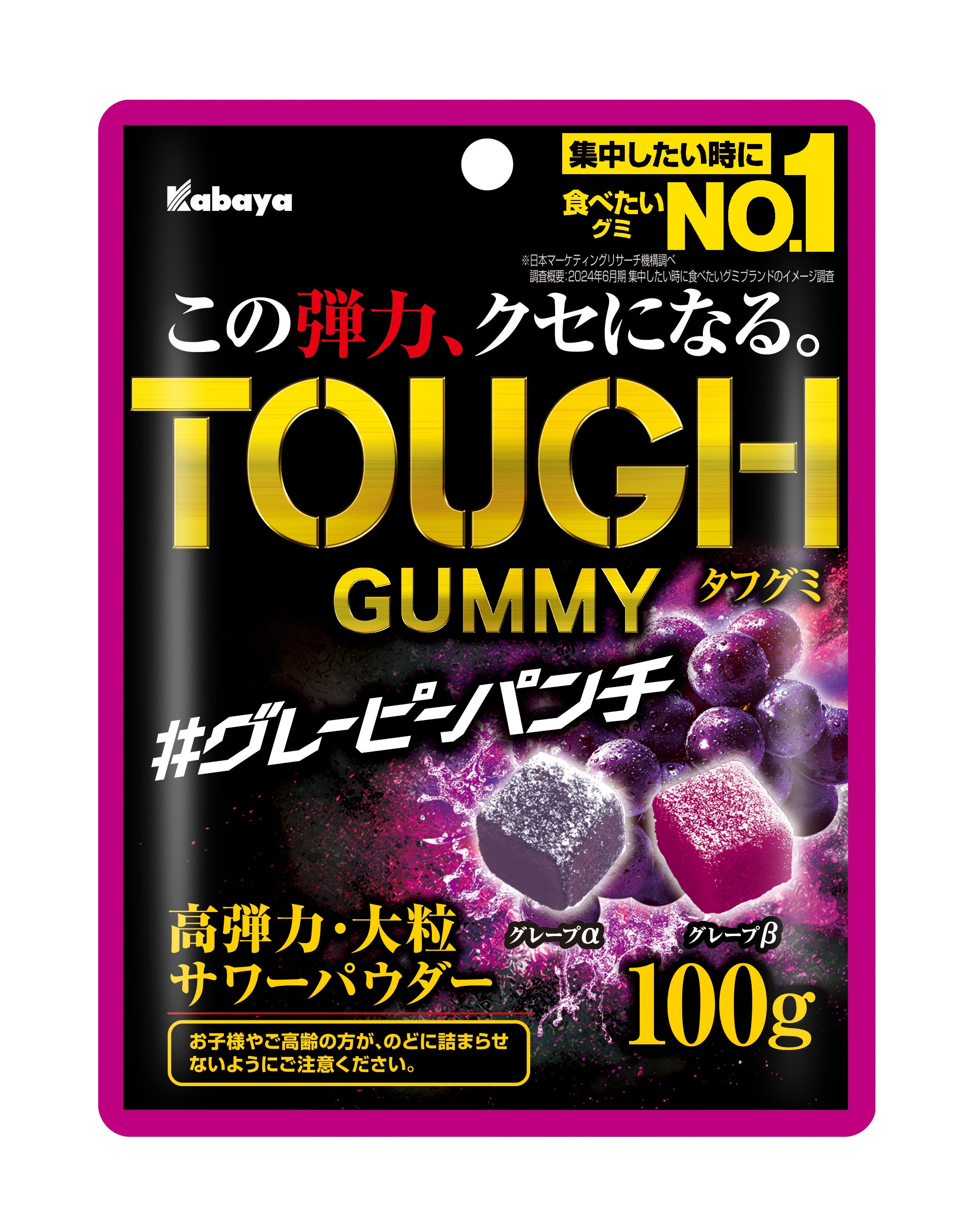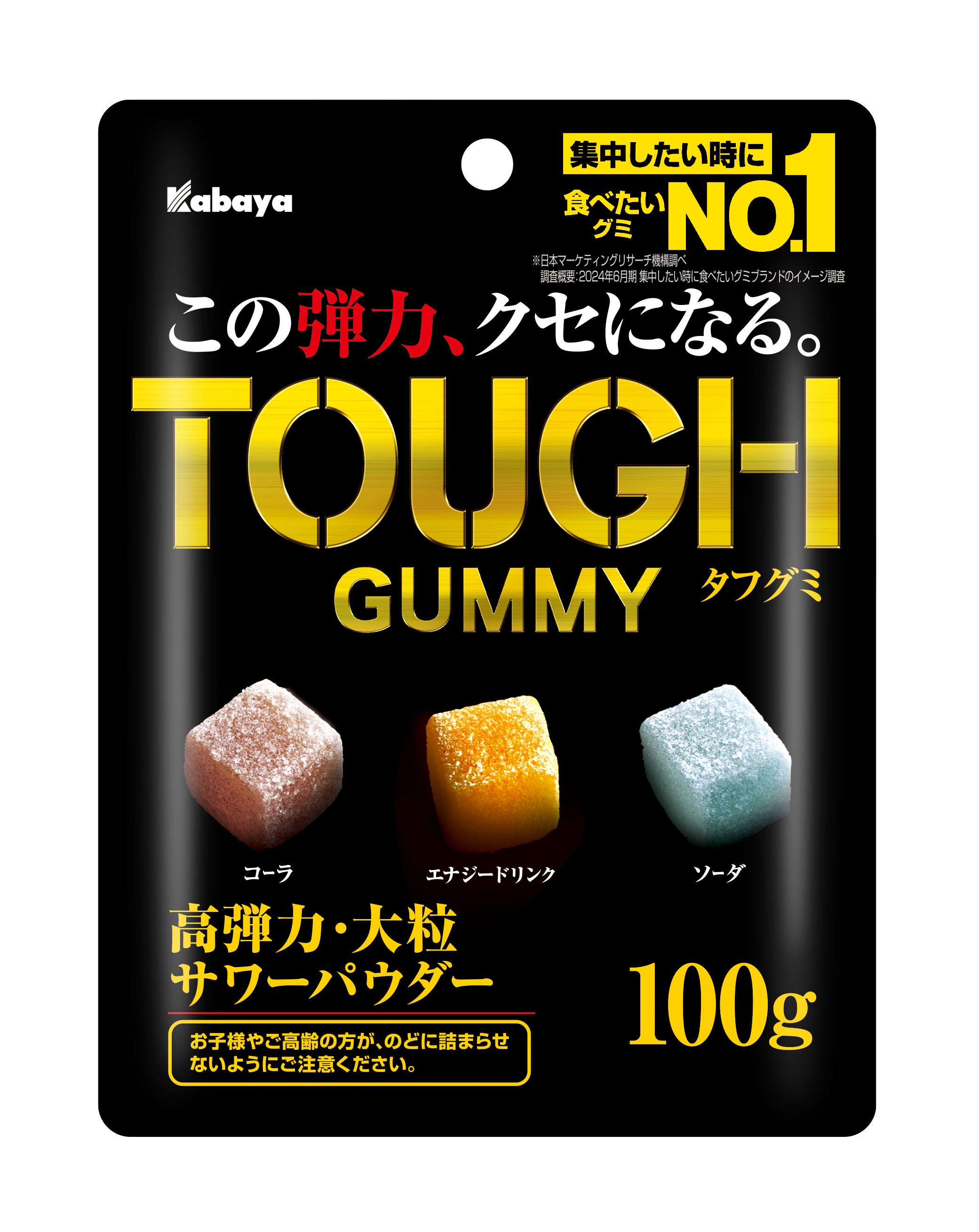 『タフグミ』は「集中したい時に食べたいグミブランド No.1」※「ハードグミ人気 No.1」※を獲得した、高弾力食感とどこから噛んでも同じ噛み応えとなるキューブ型が特長の大粒グミで、合計5品を展開しています。全国のスーパーマーケットやコンビニエンスストアで販売中。