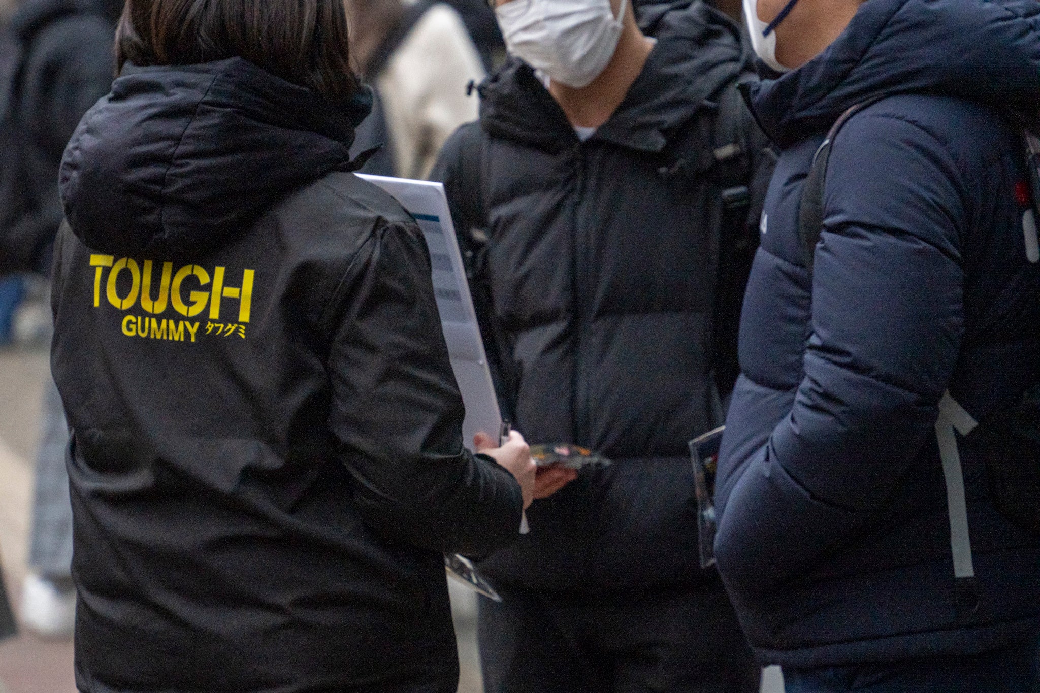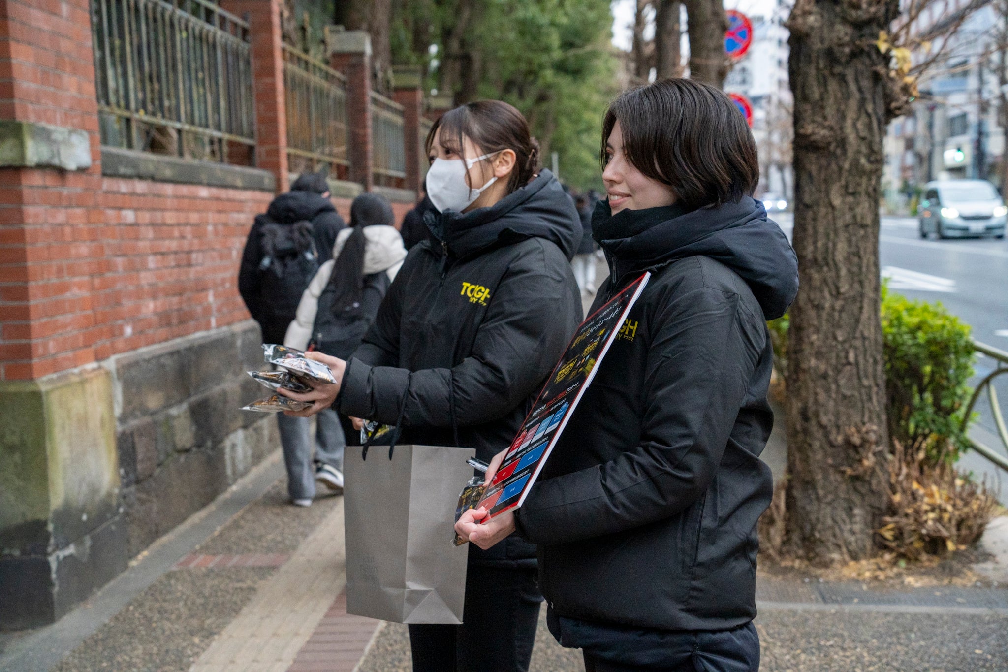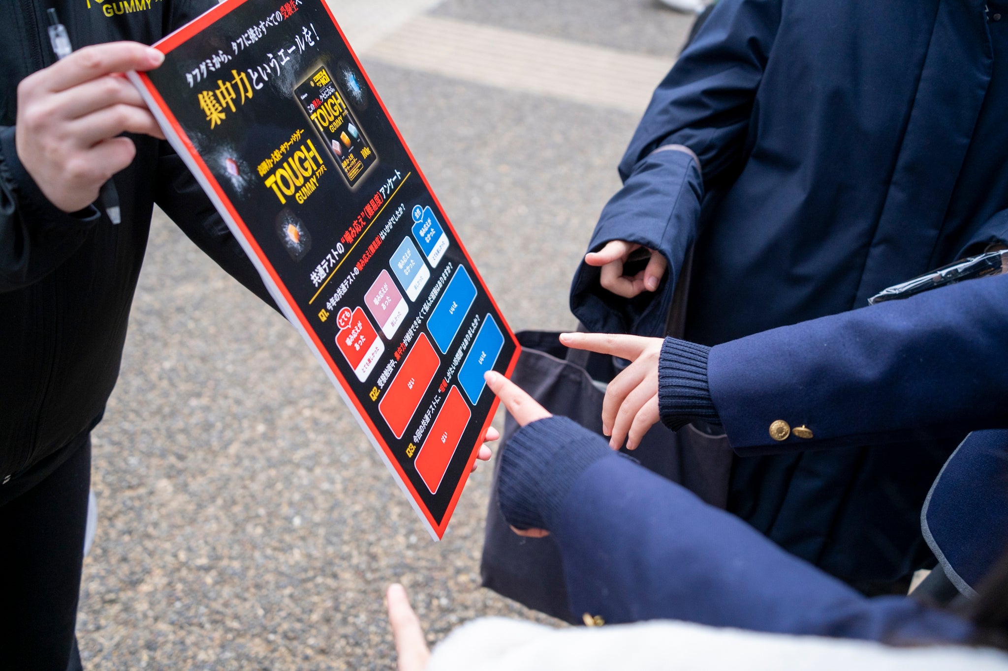 2025年1月18日(土)と19日(日)に共通テストが行われた東京大学本郷キャンパスと横浜国立大学常盤台キャンパスの試験会場周辺にて、試験後の受験生たちに向けて、『タフグミ』と集中御守ステッカーのサンプリングを実施しました。一時的に緊張がほどけた表情や、気持ちを引き締め直す表情など、様々な面持ちで会場を後にし、これから帰宅して自己採点をしたり、二次試験の対策をしたり、まだまだ集中力を切らすことができない“タフ組”の皆さん一人ひとりに、応援の気持ちを込めて手渡しました。ご自分のことだけでも手一杯であろう中、今回のサンプリング品のお渡しに対し、「ありがとうございます」という温かい言葉と笑顔を返してくださった受験生が多かったことが特に印象的でした。皆様の努力が実を結び、明るい春が訪れんことを心から願っています。