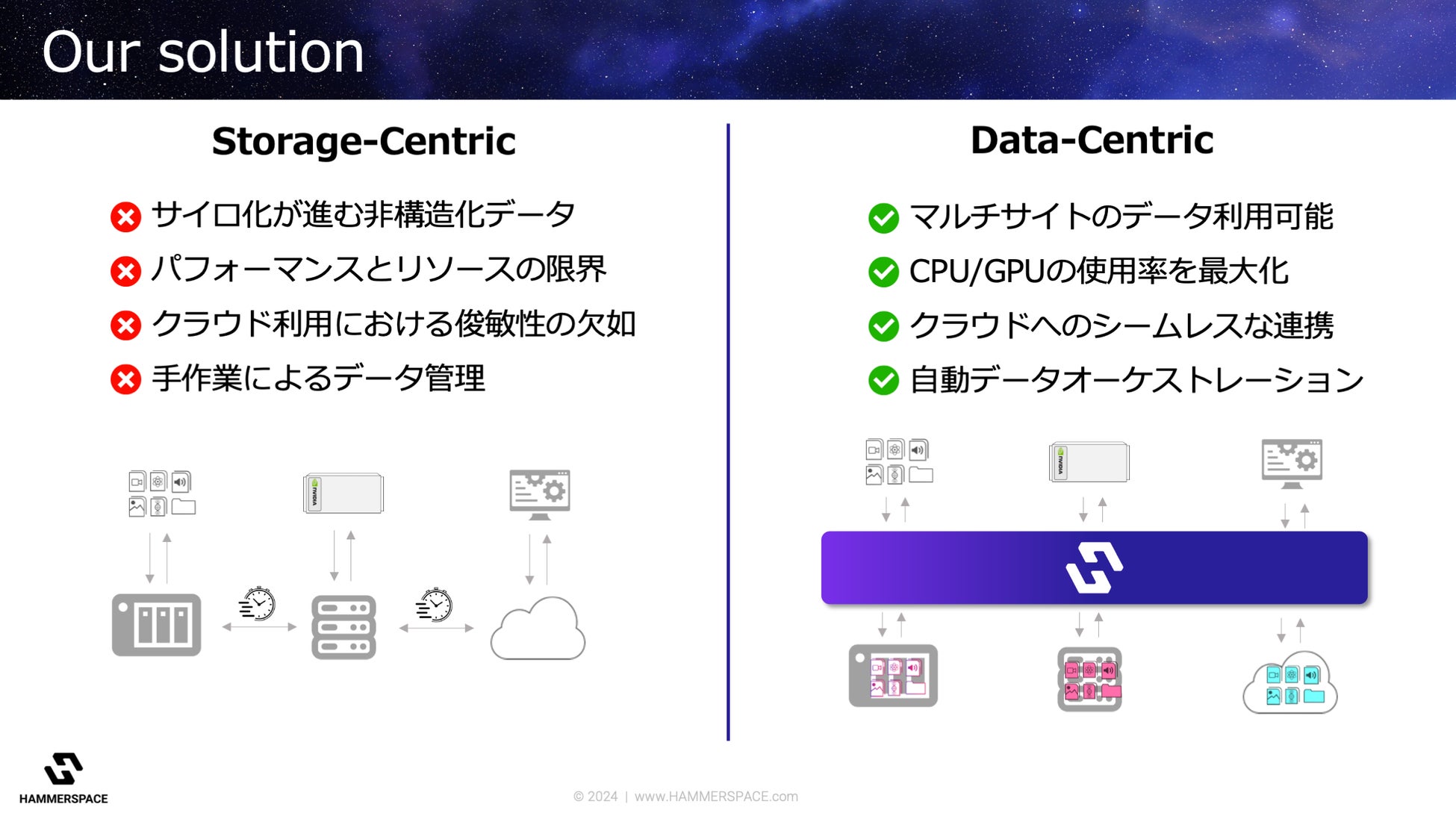 20年以上もの間、企業は「ストレージ中心」のインフラから抜け出せず、貴重なはずのデータは、見つけ難い、管理し難い、サイロ化されたいくつものストレージ・システムのどこかに閉じ込められた状態が続いてきました。非構造化データは増加し続け、さらにAIやGPUコンピューティングの台頭により、IT部門は限られた人員で大規模データを扱うという、根強い問題に対処する必要に迫られています。Hammerspaceは、既存ストレージの概念から脱却し、データ中心にアクセス・配置・管理できるアーキテクチャによって、非構造化データの使用方法と保存方法を変革します。オンプレミスでもマルチクラウド環境でも簡単にデータを扱える事に加え、GPUリソースをフル活用できるI/Oパフォーマンスを提供し、非常に効率的で標準的なアーキテクチャにより、ストレージとコンピュートリソースの両方を最大限に活用できます。