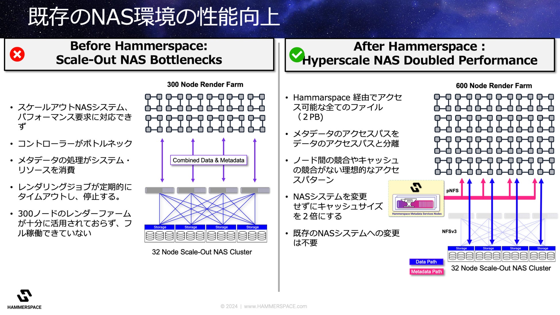 ハイパースケールNAS機能により、HPCファイルシステムのパフォーマンスとスケールを、エンタープライズNASの標準ベースと接続して組み合わせる事ができます。このハイパースケールNASアーキテクチャが、既存のエンタープライズ・スケールアウトNASのパフォーマンスを劇的に加速させた例の一つとして、ある視覚効果制作企業があります。彼らは当初、制作ワークフローを促進するために複数の拠点を結びつけるためにHammerspaceを導入しました。問題は、既存の32ノードのスケールアウトNASプラットフォームでは、300ノードのレンダーファームのI/O要件を処理するのに十分なパフォーマンスが得られないことでした。このお客様は、既存のNASプラットフォームを変更することなく、またレンダリングに使用する既存のLinuxサーバーに何もインストールすることなくLinuxに標準搭載されているpNFS v4.2クライアントを活用してI/Oの並列化によりストレージのパフォーマンスを劇的に向上させることができました。その結果、レンダーファームを600ノードまで増やしても動作でき、既存のストレージのスループットを2倍以上にすることができました。