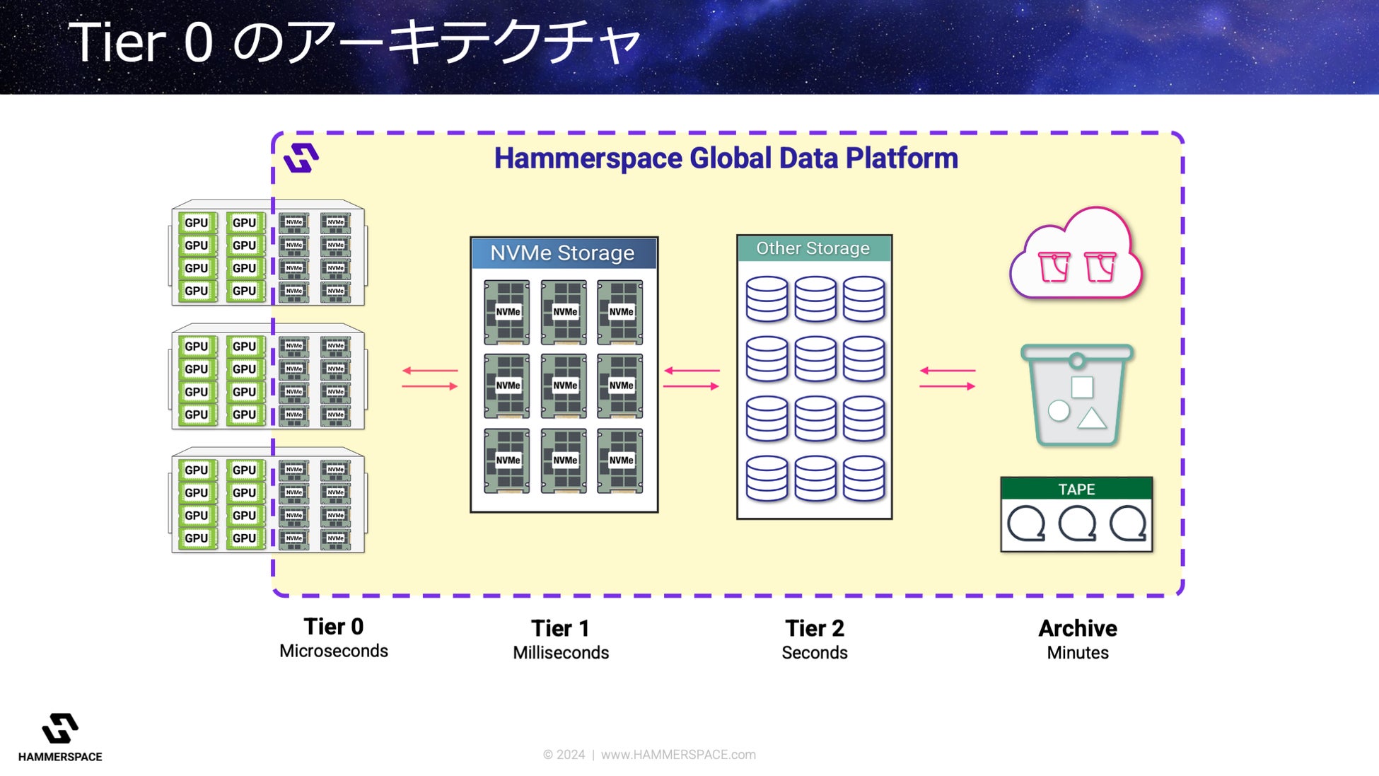 Hammerspaceは、GPUサーバー上の既存のローカルNVMeストレージを超高速で永続的な共有ストレージのTier 0に変換することで、ストレージの新しい階層をロック解除します。Hammerspace Global Data Platformにこの「取り残された状態」だったローカルNVMeストレージをシームレスにアクティブ化することで、Tier 0はローカルNVMe速度でGPUに直接データを提供し、未開拓の可能性を解き放ち、GPUコンピューティング性能とストレージ効率の両方を再定義します。